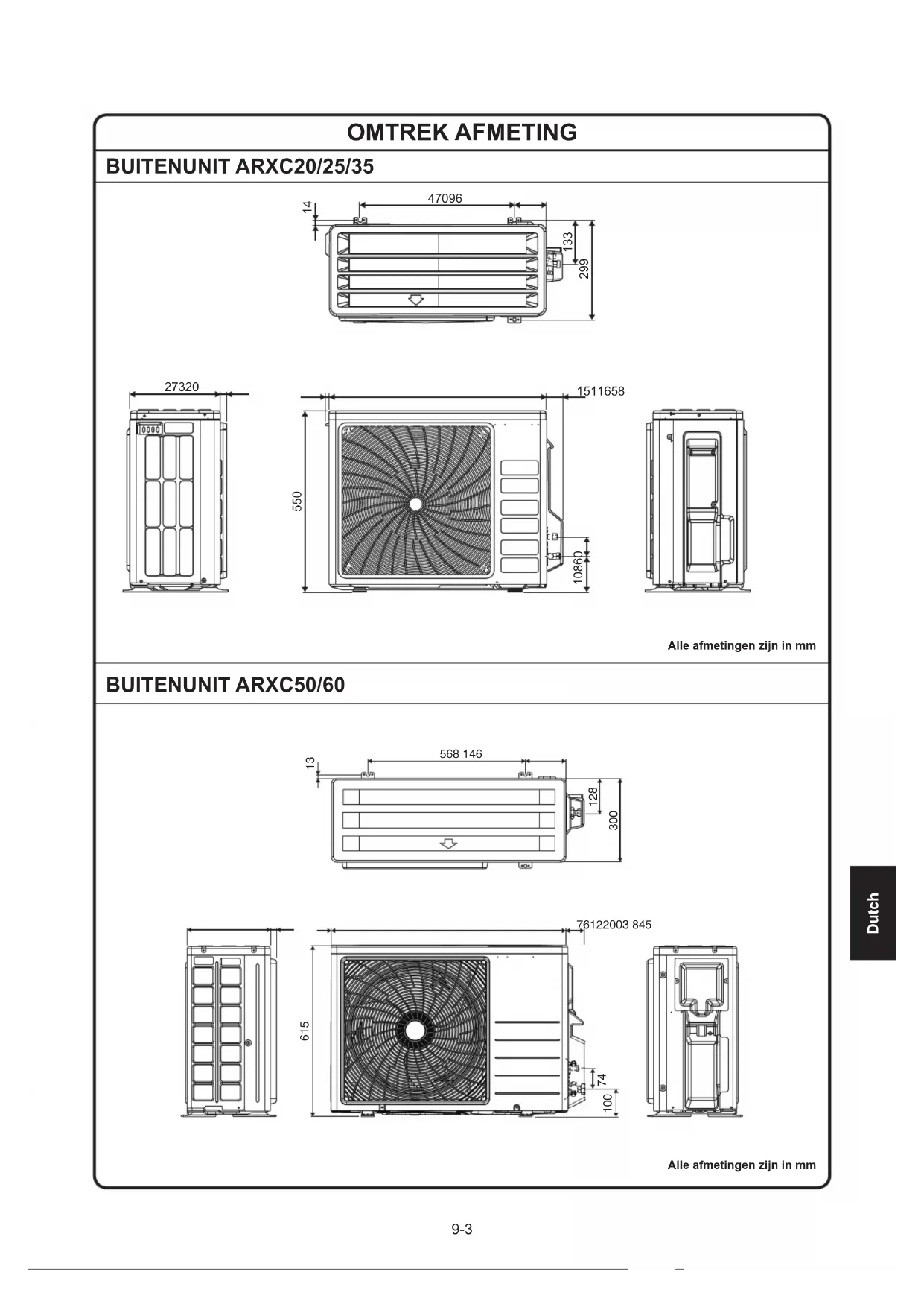 MODELNAAM PLAAT ONDERKANT ONDERKANT ACHTERKANT ACHTERKANT Alle afmetingen zijn in mm Alle afmetingen zijn in mm9-3 Dutch OMTREK AFMETING BUITENUNIT ARXC20/25/35