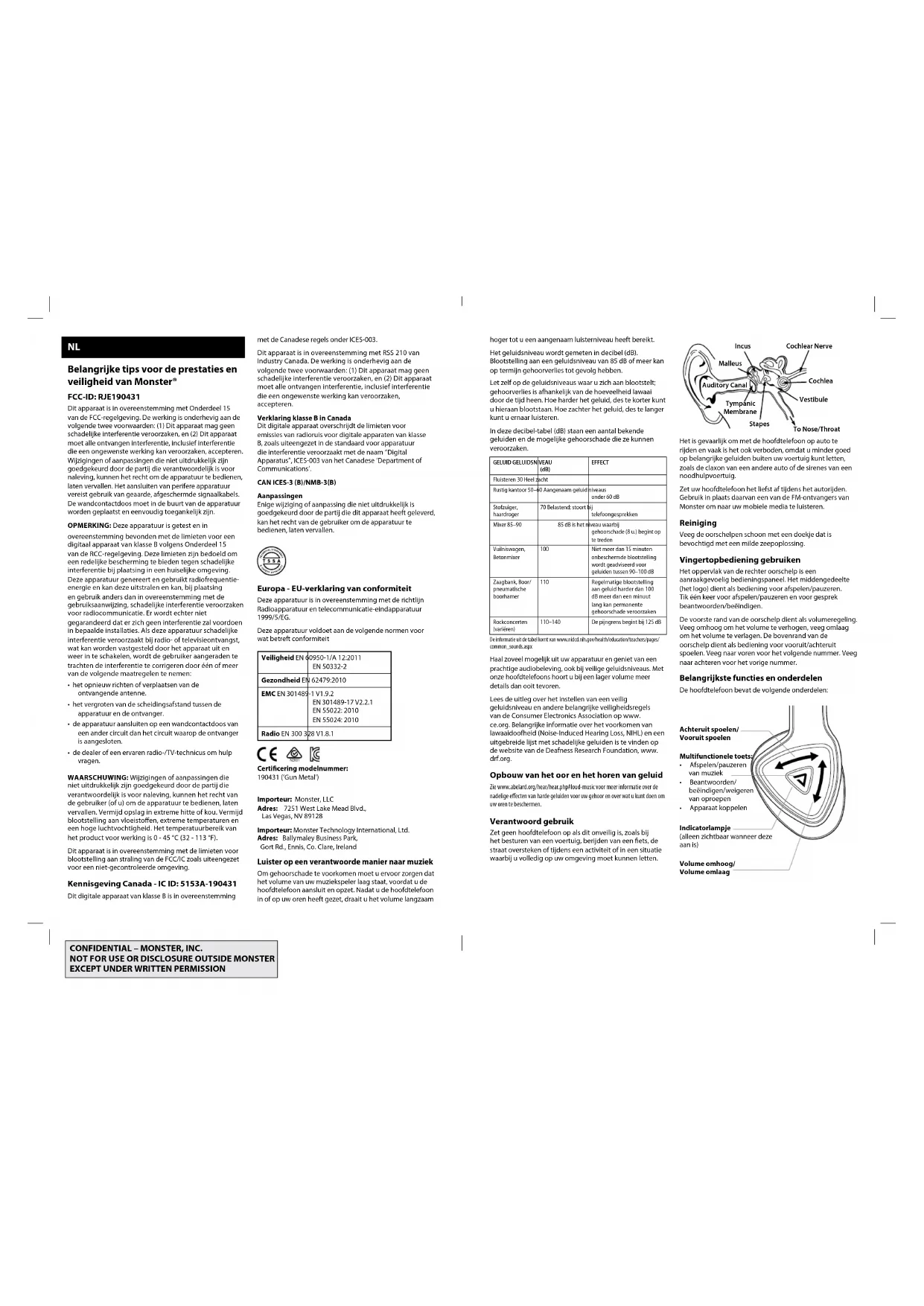 EN 301489-17 V2.2.1 EN 55022: 2010 EN 55024: 2010 Radio EN 300 328 V1.8.1 Certicering modelnummer: 190431 (‘Gun Metal’) Importeur: Monster, LLC Adres: 7251 West Lake Mead Blvd., Las Vegas, NV 89128 Importeur: Monster Technology International, Ltd. Adres: Ballymaley Business Park, Gort Rd., Ennis, Co. Clare, Ireland Luister op een verantwoorde manier naar muziek Om gehoorschade te voorkomen moet u ervoor zorgen dat het volume van uw muziekspeler laag staat, voordat u de hoofdtelefoon aansluit en opzet. Nadat u de hoofdtelefoon in of op uw oren heeft gezet, draait u het volume langzaam N2001 hoger tot u een aangenaam luisterniveau heeft bereikt. Het geluidsniveau wordt gemeten in decibel (dB). Blootstelling aan een geluidsniveau van 85 dB of meer kan op termijn gehoorverlies tot gevolg hebben. Let zelf op de geluidsniveaus waar u zich aan blootstelt; gehoorverlies is afhankelijk van de hoeveelheid lawaai door de tijd heen. Hoe harder het geluid, des te korter kunt u hieraan blootstaan. Hoe zachter het geluid, des te langer kunt u ernaar luisteren. In deze decibel-tabel (dB) staan een aantal bekende geluiden en de mogelijke gehoorschade die ze kunnen veroorzaken. GELUID GELUIDSNIVEAU (dB) EFFECTFluisteren 30 Heel zachtRustig kantoor 50–60 Aangenaam geluid niveaus onder 60 dBStofzuiger, haardroger70 Belastend; stoort bij telefoongesprekkenMixer 85–90 85 dB is het niveau waarbij gehoorschade (8 u.) begint op te tredenVuilniswagen, Betonmixer100 Niet meer dan 15 minuten onbeschermde blootstelling wordt geadviseerd voor geluiden tussen 90–100 dBZaagbank, Boor/pneumatische boorhamer110 Regelmatige blootstelling aan geluid harder dan 100 dB meer dan een minuut lang kan permanente gehoorschade veroorzakenRockconcerten (variëren)110–140 De pijngrens begint bij 125 dBDe informatie uit de tabel komt van www.nidcd.nih.gov/health/education/teachers/pages/common_sounds.aspx Haal zoveel mogelijk uit uw apparatuur en geniet van een prachtige audiobeleving, ook bij veilige geluidsniveaus. Met onze hoofdtelefoons hoort u bij een lager volume meer details dan ooit tevoren. Lees de uitleg over het instellen van een veilig geluidsniveau en andere belangrijke veiligheidsregels van de Consumer Electronics Association op www. ce.org. Belangrijke informatie over het voorkomen van lawaaidoofheid (Noise-Induced Hearing Loss, NIHL) en een uitgebreide lijst met schadelijke geluiden is te vinden op de website van de Deafness Research Foundation, www. drf.org. Opbouw van het oor en het horen van geluid Zie www.abelard.org/hear/hear.php#loud-music voor meer informatie over de nadelige effecten van harde geluiden voor uw gehoor en over wat u kunt doen om uw oren te beschermen. Verantwoord gebruik Zet geen hoofdtelefoon op als dit onveilig is, zoals bij het besturen van een voertuig, berijden van een fiets, de straat oversteken of tijdens een activiteit of in een situatie waarbij u volledig op uw omgeving moet kunnen letten. Het is gevaarlijk om met de hoofdtelefoon op auto te rijden en vaak is het ook verboden, omdat u minder goed op belangrijke geluiden buiten uw voertuig kunt letten, zoals de claxon van een andere auto of de sirenes van een noodhulpvoertuig. Zet uw hoofdtelefoon het liefst af tijdens het autorijden. Gebruik in plaats daarvan een van de FM-ontvangers van Monster om naar uw mobiele media te luisteren. Reiniging Veeg de oorschelpen schoon met een doekje dat is bevochtigd met een milde zeepoplossing. Vingertopbediening gebruiken Het oppervlak van de rechter oorschelp is een aanraakgevoelig bedieningspaneel. Het middengedeelte (het logo) dient als bediening voor afspelen/pauzeren. Tik één keer voor afspelen/pauzeren en voor gesprek beantwoorden/beëindigen. De voorste rand van de oorschelp dient als volumeregeling. Veeg omhoog om het volume te verhogen, veeg omlaag om het volume te verlagen. De bovenrand van de oorschelp dient als bediening voor vooruit/achteruit spoelen. Veeg naar voren voor het volgende nummer. Veeg naar achteren voor het vorige nummer. Belangrijkste functies en onderdelen De hoofdtelefoon bevat de volgende onderdelen: IncusCochlear NerveStapesTympanicMembraneAuditory CanalCochleaMalleusVestibule To Nose/Throat Multifunctionele toets:
