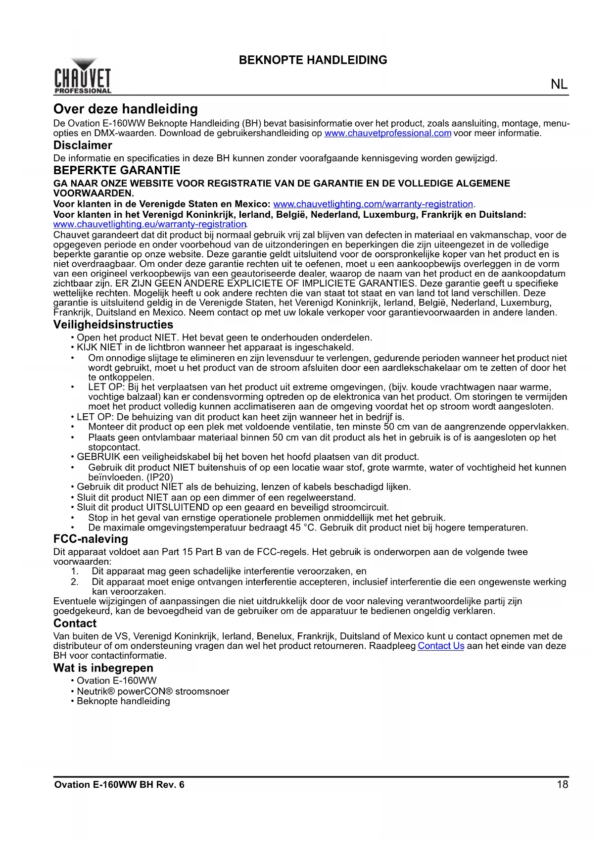 Chauvet garandeert dat dit product bij normaal gebruik vrij zal blijven van defecten in materiaal en vakmanschap, voor de opgegeven periode en onder voorbehoud van de uitzonderingen en beperkingen die zijn uiteengezet in de volledige beperkte garantie op onze website. Deze garantie geldt uitsluitend voor de oorspronkelijke koper van het product en is niet overdraagbaar. Om onder deze garantie rechten uit te oefenen, moet u een aankoopbewijs overleggen in de vorm van een origineel verkoopbewijs van een geautoriseerde dealer, waarop de naam van het product en de aankoopdatum zichtbaar zijn. ER ZIJN GEEN ANDERE EXPLICIETE OF IMPLICIETE GARANTIES. Deze garantie geeft u specifieke wettelijke rechten. Mogelijk heeft u ook andere rechten die van staat tot staat en van land tot land verschillen. Deze garantie is uitsluitend geldig in de Verenigde Staten, het Verenigd Koninkrijk, Ierland, België, Nederland, Luxemburg, Frankrijk, Duitsland en Mexico. Neem contact op met uw lokale verkoper voor garantievoorwaarden in andere landen. Veiligheidsinstructies