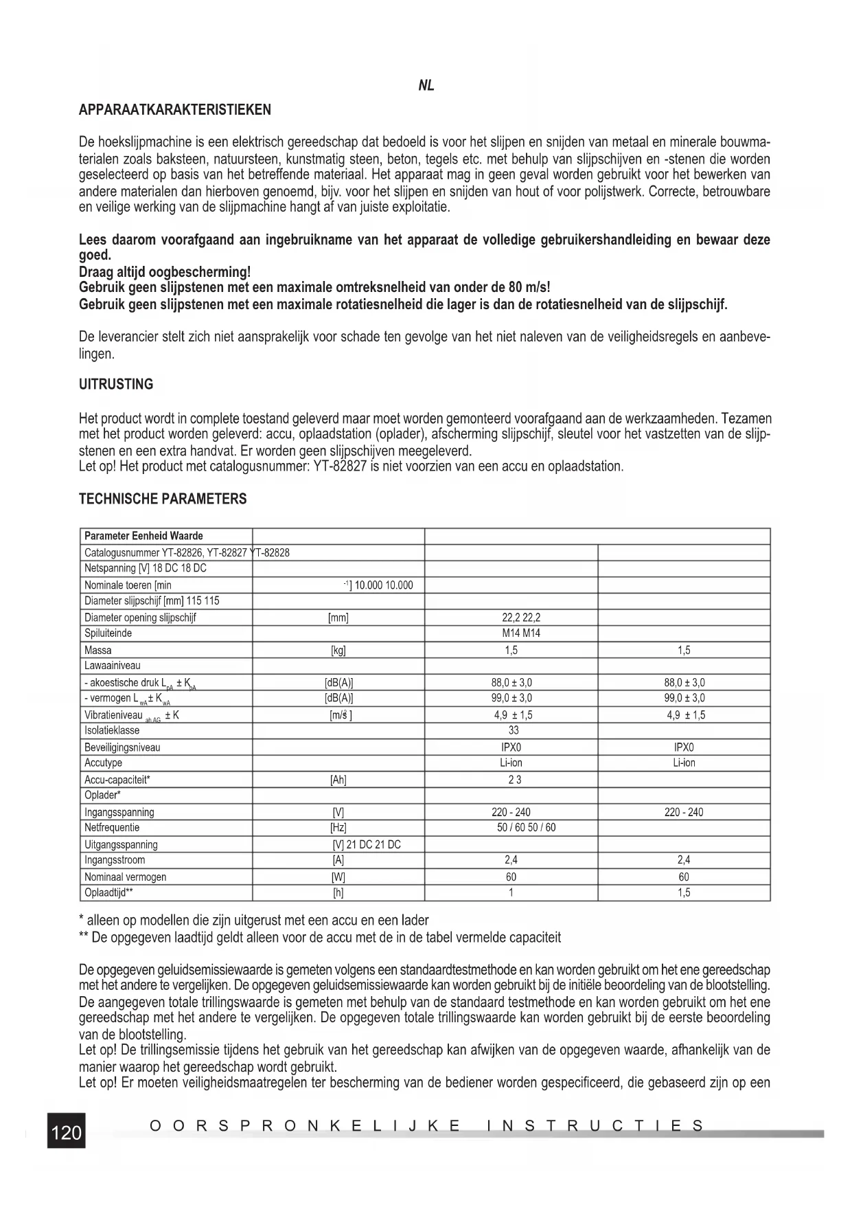 APPARAATKARAKTERISTIEKEN De hoekslijpmachine is een elektrisch gereedschap dat bedoeld is voor het slijpen en snijden van metaal en minerale bouwma- terialen zoals baksteen, natuursteen, kunstmatig steen, beton, tegels etc. met behulp van slijpschijven en -stenen die worden geselecteerd op basis van het betreff ende materiaal. Het apparaat mag in geen geval worden gebruikt voor het bewerken van andere materialen dan hierboven genoemd, bijv. voor het slijpen en snijden van hout of voor polijstwerk. Correcte, betrouwbare en veilige werking van de slijpmachine hangt af van juiste exploitatie. Lees daarom voorafgaand aan ingebruikname van het apparaat de volledige gebruikershandleiding en bewaar deze goed. Draag altijd oogbescherming! Gebruik geen slijpstenen met een maximale omtreksnelheid van onder de 80 m/s! Gebruik geen slijpstenen met een maximale rotatiesnelheid die lager is dan de rotatiesnelheid van de slijpschijf. De leverancier stelt zich niet aansprakelijk voor schade ten gevolge van het niet naleven van de veiligheidsregels en aanbeve- lingen. UITRUSTING Het product wordt in complete toestand geleverd maar moet worden gemonteerd voorafgaand aan de werkzaamheden. Tezamen met het product worden geleverd: accu, oplaadstation (oplader), afscherming slijpschijf, sleutel voor het vastzetten van de slijp- stenen en een extra handvat. Er worden geen slijpschijven meegeleverd. Let op! Het product met catalogusnummer: YT-82827 is niet voorzien van een accu en oplaadstation. TECHNISCHE PARAMETERS Parameter Eenheid Waarde Catalogusnummer YT-82826, YT-82827 YT-82828 Netspanning [V] 18 DC 18 DC Nominale toeren [min