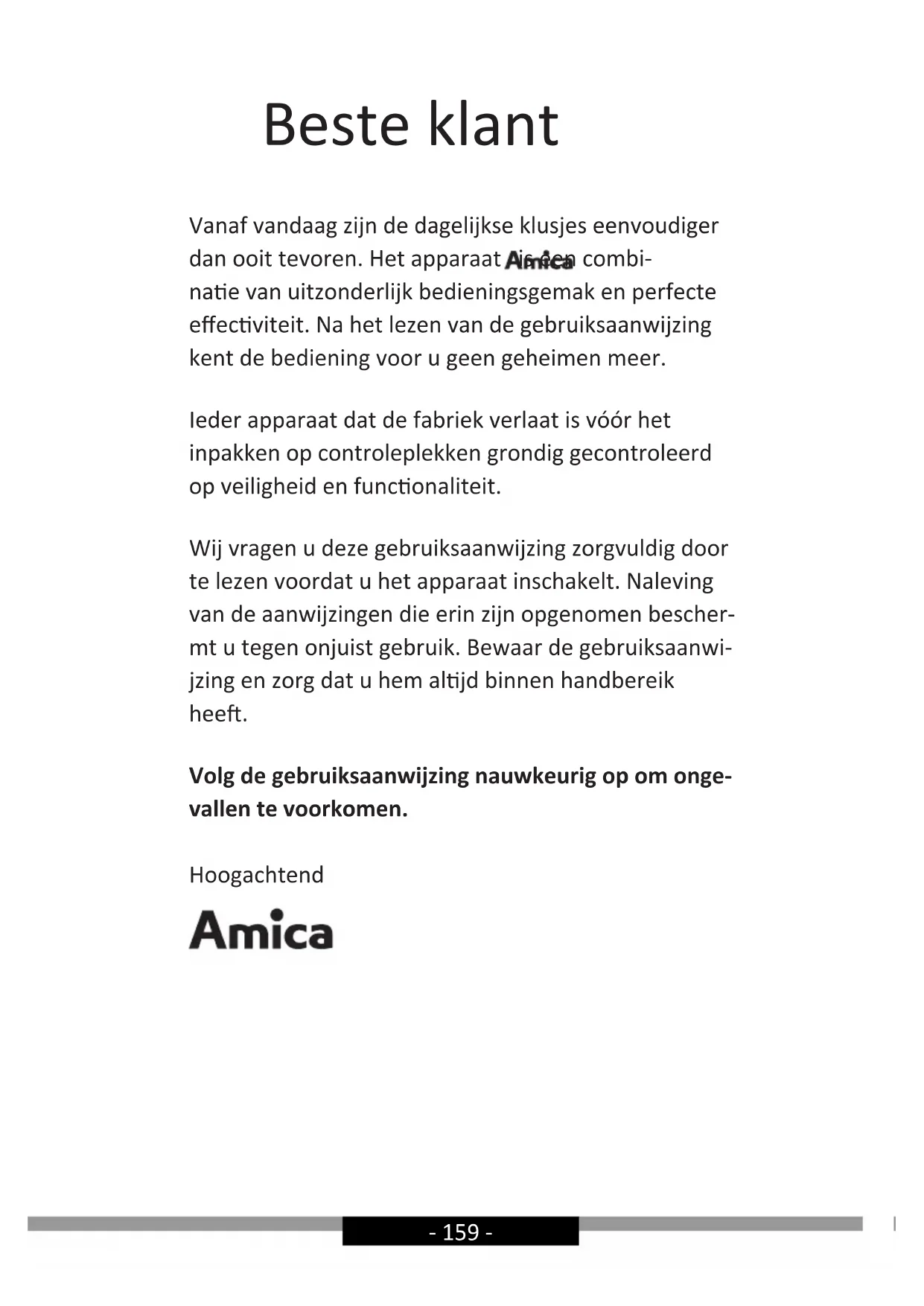 - niskonaponske direktive 2014/35/UE• direktive elektromagnetske kompatibilnosti 2014/30/UE• direktive ekodizajna 2009/125/UE• direktive RoHS 2011/65/UE i zato je proizvod označen i poseduje deklaraciju usklađenosti koja je pre- dočavana organima za nadzor tržišta.- 159 - Beste klant Vanaf vandaag zijn de dagelijkse klusjes eenvoudiger dan ooit tevoren. Het apparaat is een combi- nae van uitzonderlijk bedieningsgemak en perfecte eecviteit. Na het lezen van de gebruiksaanwijzing kent de bediening voor u geen geheimen meer. Ieder apparaat dat de fabriek verlaat is vóór het inpakken op controleplekken grondig gecontroleerd op veiligheid en funconaliteit. Wij vragen u deze gebruiksaanwijzing zorgvuldig door te lezen voordat u het apparaat inschakelt. Naleving van de aanwijzingen die erin zijn opgenomen bescher- mt u tegen onjuist gebruik. Bewaar de gebruiksaanwi- jzing en zorg dat u hem aljd binnen handbereik hee. Volg de gebruiksaanwijzing nauwkeurig op om onge- vallen te voorkomen. Hoogachtend- 160 -