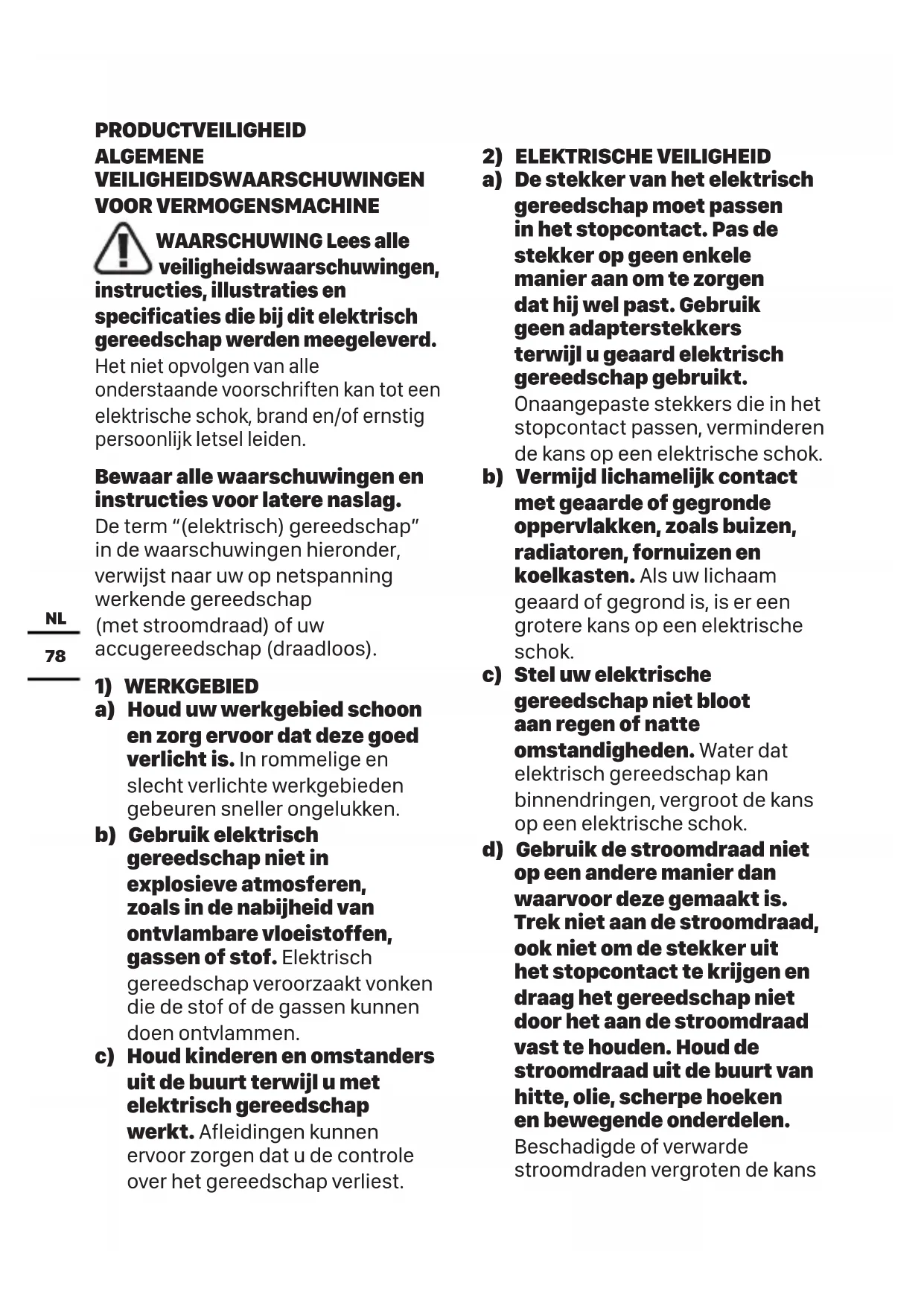PRODUCTVEILIGHEID ALGEMENE VEILIGHEIDSWAARSCHUWINGEN VOOR VERMOGENSMACHINE WAARSCHUWING Lees alle veiligheidswaarschuwingen, instructies, illustraties en specificaties die bij dit elektrisch gereedschap werden meegeleverd. Het niet opvolgen van alle onderstaande voorschriften kan tot een elektrische schok, brand en/of ernstig persoonlijk letsel leiden. Bewaar alle waarschuwingen en instructies voor latere naslag. De term “(elektrisch) gereedschap” in de waarschuwingen hieronder, verwijst naar uw op netspanning werkende gereedschap (met stroomdraad) of uw accugereedschap (draadloos).