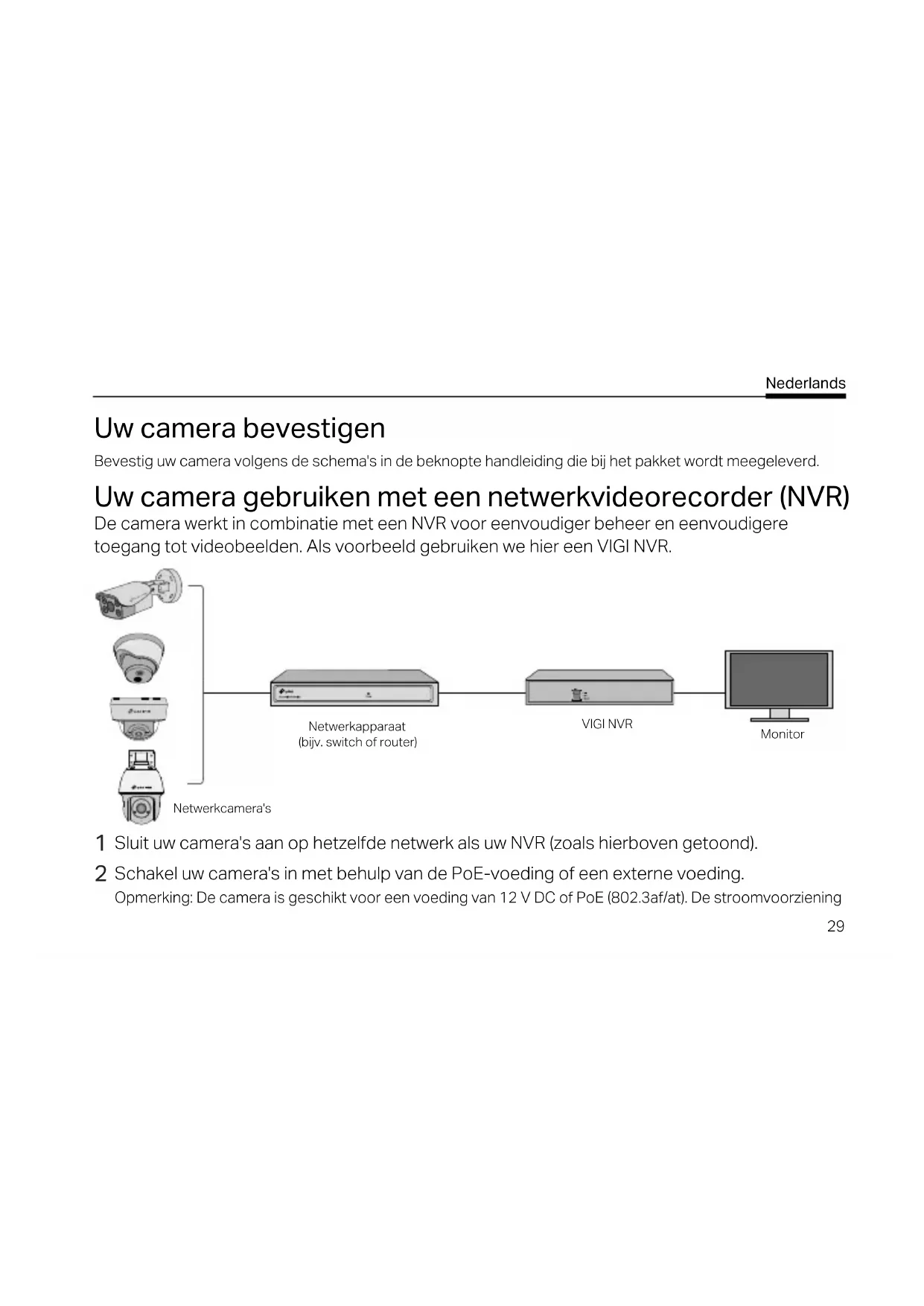 As câmaras na mesma rede que o computador podem ser automaticamente descobertas. Ir para Definições > Dispositivos Descobertos, clicar + Adicionar para ativar as suas câmaras descobertas, definindo as palavras-passe, e seguindo as instruções para adicionar as suas câmaras. Para perguntas frequentes, consulte https://www.tp-link.com/support/faq/2850/29 Nederlands Uw camera bevestigen Bevestig uw camera volgens de schema's in de beknopte handleiding die bij het pakket wordt meegeleverd. Uw camera gebruiken met een netwerkvideorecorder (NVR) De camera werkt in combinatie met een NVR voor eenvoudiger beheer en eenvoudigere toegang tot videobeelden. Als voorbeeld gebruiken we hier een VIGI NVR. Netwerkapparaat (bijv. switch of router) VIGI NVR Monitor Netwerkcamera's