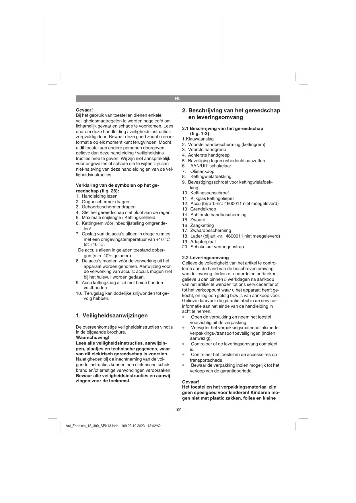 Bewaar de verpakking indien mogelijk tot het verloop van de garantieperiode. Gevaar! Het toestel en het verpakkingsmateriaal zijn geen speelgoed voor kinderen! Kinderen mo- gen niet met plastic zakken, folies en kleine Anl_Fortexxa_18_300_SPK13.indb 109 23.10.2023 13:52:52NL