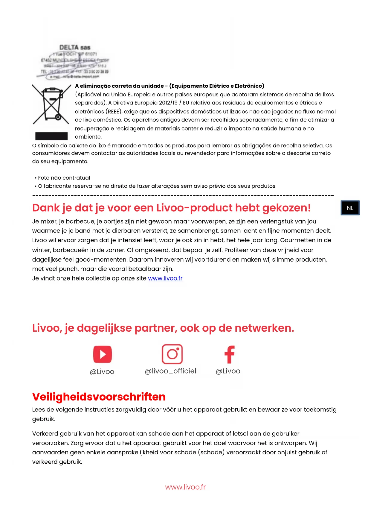 Dank je dat je voor een Livoo-product hebt gekozen! Je mixer, je barbecue, je oortjes zijn niet gewoon maar voorwerpen, ze zijn een verlengstuk van jou waarmee je je band met je dierbaren versterkt, ze samenbrengt, samen lacht en fijne momenten deelt. Livoo wil ervoor zorgen dat je intensief leeft, waar je ook zin in hebt, het hele jaar lang. Gourmetten in de winter, barbecueën in de zomer. Of omgekeerd, dat bepaal je zelf. Profiteer van deze vrijheid voor dagelijkse feel good-momenten. Daarom innoveren wij voortdurend en maken wij slimme producten, met veel punch, maar die vooral betaalbaar zijn. Je vindt onze hele collectie op onze site www.livoo.fr