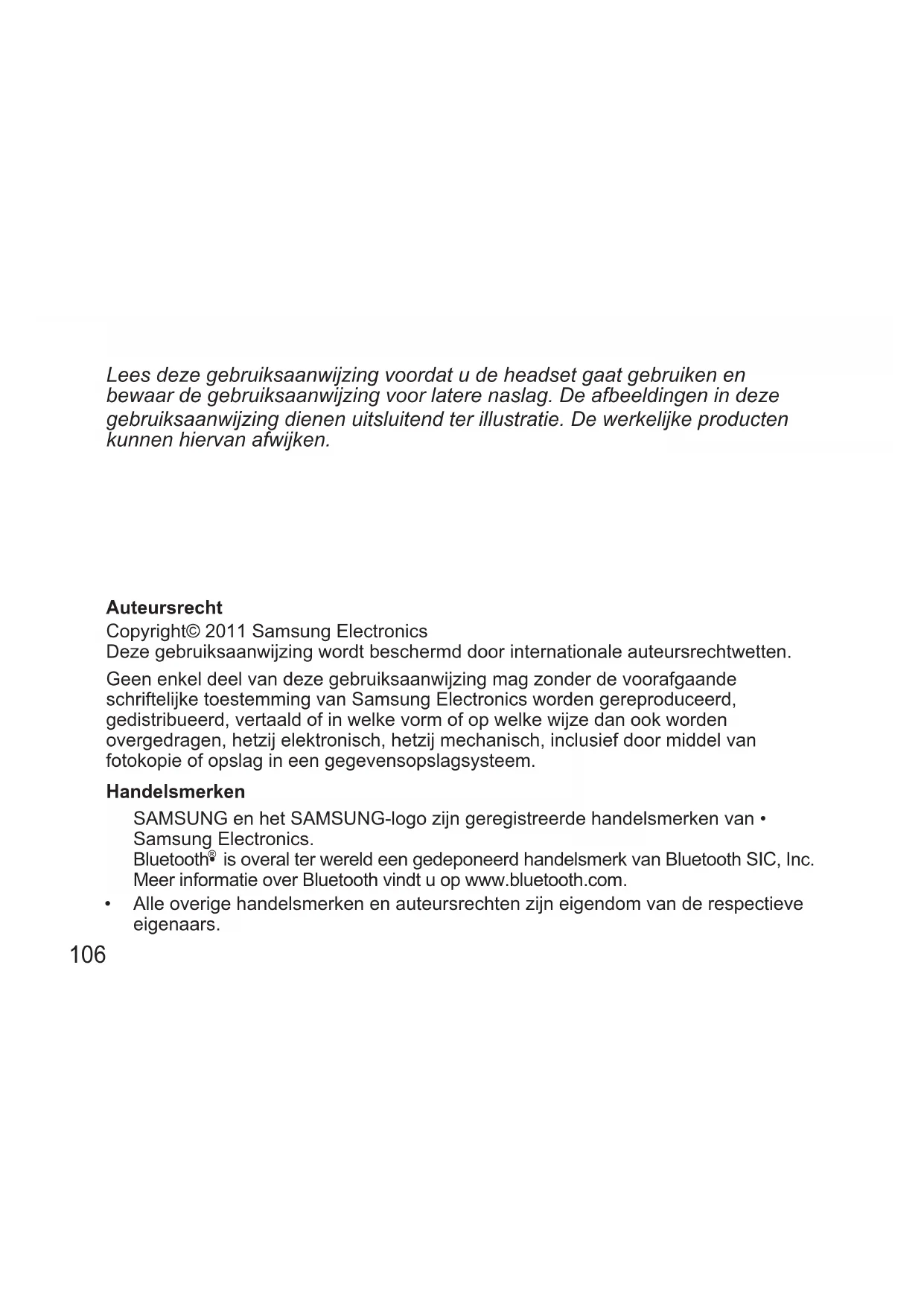 is overal ter wereld een gedeponeerd handelsmerk van Bluetooth SIC, Inc. Meer informatie over Bluetooth vindt u op www.bluetooth.com. Alle overige handelsmerken en auteursrechten zijn eigendom van de respectieve • eigenaars. Lees deze gebruiksaanwijzing voordat u de headset gaat gebruiken en bewaar de gebruiksaanwijzing voor latere naslag. De afbeeldingen in deze gebruiksaanwijzing dienen uitsluitend ter illustratie. De werkelijke producten kunnen hiervan afwijken.107 Nederlands Lees alle veiligheidsinformatie voordat u de headset gaat gebruiken, zodat u zeker weet dat u deze op een veilige en juiste manier gebruikt. Veiligheidsinformatie Neem de regelgeving in uw land in acht als u de headset tijdens het rijden gebruikt.• Haal de headset nooit uit elkaar en breng geen wijzigingen aan, om welke reden dan ook. • Als u dit wel doet, werkt de headset mogelijk niet meer naar behoren of kan deze vlam vatten. Laat de headset alleen repareren door een geautoriseerd servicecenter. Houd het apparaat en alle bijbehorende onderdelen en accessoires buiten het bereik van • kleine kinderen en dieren. Kleine onderdelen kunnen verstikkingsgevaar opleveren of schadelijk zijn als deze worden ingeslikt. Vermijd blootstelling van het apparaat aan extreme temperaturen (onder 0 °C of boven • 45 °C). Extreme temperaturen kunnen leiden tot vervorming van het apparaat, en kunnen het oplaadvermogen en de levensduur van het apparaat verminderen. Laat het apparaat niet nat worden. Vloeistoffen kunnen ernstige schade veroorzaken. • Raak het apparaat niet aan met natte handen. Waterschade aan het apparaat kan de garantie van de fabrikant doen vervallen. Gebruik het licht van het apparaat niet vlak bij de ogen van kinderen of dieren. • Gebruik het apparaat niet tijdens een onweersbui. Onweersbuien kunnen ertoe leiden • dat het apparaat niet goed functioneert en kunnen het risico van een elektrische schok vergroten. Langere blootstelling aan te hard geluid kan gehoorschade veroorzaken. Tijdens het rijden naar te luide muziek luisteren kan u aeiden en een ongeval veroorzaken. Gebruik altijd een zo laag mogelijk gespreksvolume.108 Aan de slag Onderdelen van de headset Controleer of u over de volgende items beschikt: reisadapter, headset • en gebruiksaanwijzing. Welke items precies zijn geleverd, is afhankelijk van uw regio.• Bevestigingsklem Luidspreker Lampje Volumeknop Oproepknop Aansluitpunt oplader Microfoon109 Nederlands Knopfuncties Knop Functie Oproep- knop Ingedrukt houden om de headset in te schakelen.• 3 seconden ingedrukt houden om de headset uit • te schakelen. 3 seconden ingedrukt houden om de koppelingsmodus • te activeren terwijl de headset is uitgeschakeld. Indrukken om een oproep tot stand te brengen of aan • te nemen. Indrukken om een gesprek te beëindigen.• Ingedrukt houden om een binnenkomende oproep • te weigeren. Ingedrukt houden om een gesprek in de wacht te zetten.• Ingedrukt houden om heen en weer te schakelen tussen • gesprekken. Volume Indrukken om het volume aan te passen.• Ingedrukt houden om de microfoon in- of uit te schakelen.•110 De headset opladen De headset bevat een oplaadbare batterij die niet kan worden verwijderd. Zorg ervoor dat de headset volledig is opgeladen voordat u deze in gebruik neemt. Zie pagina 112 voor informatie over het controleren van de batterijstatus. 1 Sluit de oplader aan op het oplaadpunt op de headset. 2 Steek de stekker van de oplader in een stopcontact. Tijdens het laden wordt het lampje rood. Als niet met laden wordt begonnen, koppelt u de reisadapter los en sluit u deze opnieuw aan. 3 Wanneer de headset volledig is opgeladen, wordt het rode lampje blauw. Koppel de reisadapter los van het stopcontact en de headset.111 Nederlands Gebruik alleen door Samsung goedgekeurde opladers. Gebruik van • niet-goedgekeurde opladers of opladers van andere leveranciers dan Samsung kan de headset beschadigen of in extreme gevallen een explosie veroorzaken, en de garantie op het product doen vervallen. De prestaties van de batterij gaan in de loop van de tijd, na vele malen • opladen en ontladen van de headset, achteruit. Dat geldt voor alle oplaadbare batterijen en is normaal. Plaats geen oproepen of neem geen oproepen aan terwijl het apparaat • wordt opgeladen. Koppel eerst de headset los van de oplader en neem pas daarna de oproep aan. Verwijder de netstekker van de reisadapter uit het stopcontact wanneer • u deze niet gebruikt. Dat bespaart energie. De reisadapter heeft geen aan/uit-schakelaar, dus u moet de netstekker van de reisadapter uit het stopcontact verwijderen om de stroomvoorziening te onderbreken. Plaats de reisadapter bij gebruik in de buurt van het stopcontact. Wanneer de batterij van de headset bijna leeg is Als de batterij bijna leeg is, begint de headset te piepen en het rode lampje te knipperen. Zie pagina 110 voor informatie over het opladen van de batterij. Als de stroomtoevoer naar de headset tijdens een oproep wordt onderbroken, wordt de oproep automatisch overgezet naar de telefoon.112 De batterijstatus controleren U controleert de batterijstatus door de oproepknop en de knop Volume omlaag tegelijkertijd ingedrukt te houden. Afhankelijk van de batterijstatus knippert het lampje vijfmaal in een van de volgende kleuren: Batterijstatus Kleur van lampje Meer dan 80% Blauw 80 ~20% Paars Minder dan 20% Rood113 Nederlands De headset dragen Buig de bevestigingsklem niet te ver open en oefen er niet te veel druk • op uit. De klem of de headset kan hierdoor beschadigd raken. Hebt u problemen met de gesprekskwaliteit, controleer dan of u het • luistergedeelte goed tegen uw oor aan houdt en of de microfoon niet wordt geblokkeerd. De gesprekskwaliteit is afhankelijk van de manier waarop u uw • Bluetooth-headset vasthoudt. Om storingen te beperken kunt u de headset tijdens het spreken het beste midden onderaan vasthouden.114 De headset gebruiken In dit gedeelte wordt uitgelegd hoe u de headset in- of uitscha