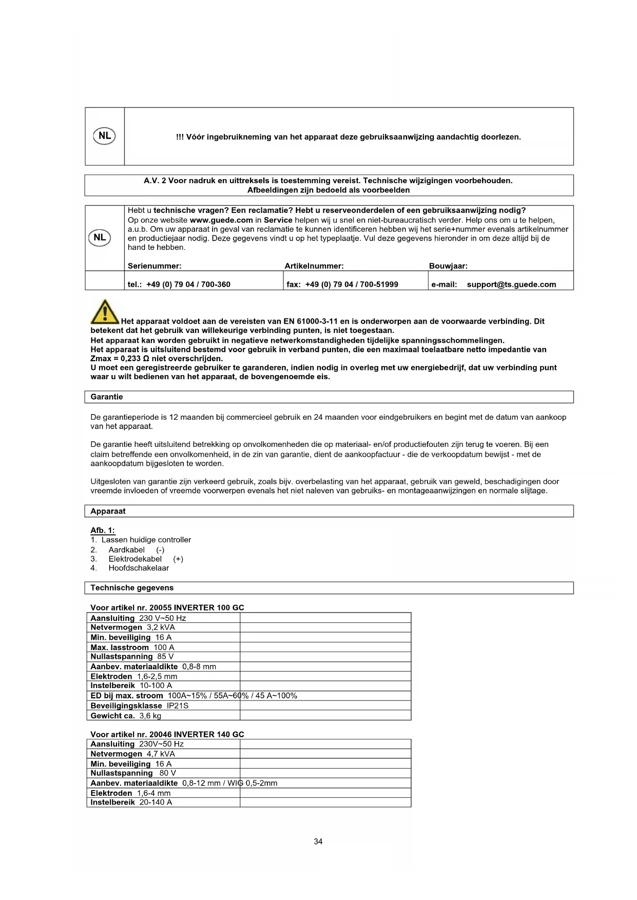 - als het lasapparaat wordt overbelast. Lassen met mantelelektroden Het lasapparaat is voor alle soorten van elektroden geschikt als ook voor cellulose elektroden (AWS 6010). Gebruik een bevestigingsklem voor elektroden, zonder uitstekende borgschroeven, die aan de huidige veiligheidsstandaards beantwoorden. Overtuigt u zich dat de hoofdschakelaar op de achterkant van het lasapparaat op de positie “0” is ingesteld, resp. dat de kabel van de hoofdtoevoer niet in het stopcontact zit. Verbind de laskabels, in overeenstemming met hun polariteit en volgens de aanwijzingen van de producent van de elektroden. Het lasstroomcircuit mag niet opzettelijk in direct contact met de beschermkabel gebracht worden, tenzij aan het lasdeel. Als de aarding met de beschermkabel bewust aan het werkstuk wordt gemaakt, dient de verbinding zo kort mogelijk te zijn. De dwarsdoorsnede van de beschermkabel dient minimaal zo groot te zijn als de dwarsdoorsnede van de terugvoerkabel van de lasstroom. Beide kabels moeten aan het zelfde werkstuk aangesloten worden. Gebruik de aardklemmen aan het apparaat of een aardklem in de buurt. Alle voorzorgsmaatregelen dienen zodanig genomen te worden, om ongewenste stroom te vermijden. Controleer of de netspanning met de ingangsspanning van het apparaat correspondeert. Verbinding van de hoofdstroomkabel: bij het aanbrengen van de stekker moet op de juiste capaciteit gelet worden en dat de geelgroene draad van de hoofdkabel met de aardstekker verbonden is. De capaciteit van de thermische magneetschakelaar of van de beveiligingen in de hoofdstroomleiding moeten groter of gelijk aan de door het apparaat absorberende stroom l1 zijn. De absorberende stroom l1 is aan de hand van de technische specificaties van het apparaat, in overeenstemming met de hoofdtoevoerspanning U1, te bepalen. Alle verlengkabels moeten een dwarsdoorsnede hebben die aan de geabsorbeerde stroom l1 beantwoordt. Schakel de stroomtoevoer aan de hoofdschakelaar aan de achterkant van het apparaat in. WAARSCHUWING: ELEKTRISCHE SCHOKKEN KUNNEN DODELIJK ZIJN! RAAK GEEN STROOMGELEIDENDE DELEN AAN! RAAK GEEN LASUITGANGSAANSLUITINGEN AAN ALS HET APPARAAT IS INGESCHAKELD! RAAK NOOIT HET LASAPPARAAT OF DE ELEKTRODE EN DE AARDKLEM TEGELIJK AAN! De stroom dient in overeenstemming met de doorsnede van de elektrode, de laspositie en de te lassen naad gekozen te worden. Na het lassen moet er aan gedacht worden de hoofdschakelaar uit te schakelen en de elektrode uit de elektrodehouder te verwijderen. Lassen met WIG uitrusting / Accessoires: Güde art. nr. 41690