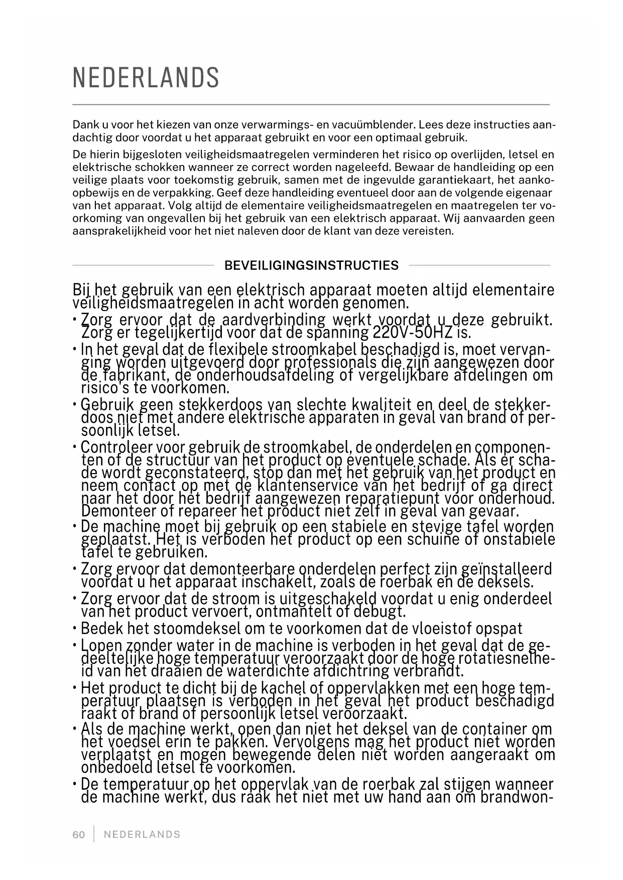 - Het product is alleen voor huishoudelijk gebruik. Bij het mixen van zacht voedsel, laat de blender met tussenpozen van een minuut dra- aien. Werk bij hard voedsel met tussenpozen van 15 seconden. Laat de blender na 3 cycli afkoelen om te voorkomen dat de motor verbrandt.