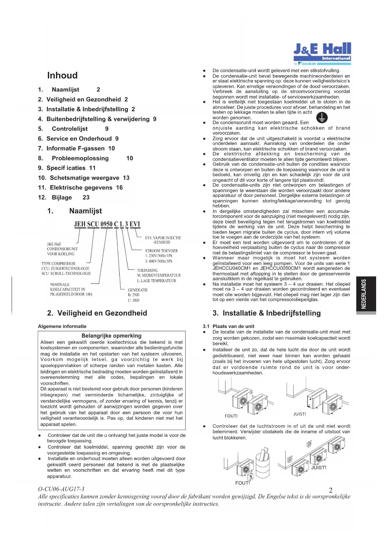 EVI: VAPOR INJECTIE -EENHEIDSTROOM TOEVOER1: 230V/50Hz/1Ph3: 400V/50Hz/3PhTOEPASSINGM: MIDDENTEMPERATUURL: LAGE TEMPERATUURGENERATIEB: 2NDC: 3RDNOMINALEKOELCAPACITEIT INPK (GEDEELD DOOR 100)TYPE COMPRESSORCCU: ZUIGERTECHNOLOGIESCU: SCROLL-TECHNOLOGIEJ&E HallCONDENSORUNITVOOR KOELING ● De condensatie-unit wordt geleverd met een stikstofvulling. ● De condensatie-unit bevat bewegende machineonderdelen en er staat elektrische spanning op: deze kunnen veiligheidsrisico’s opleveren. Kan ernstige verwondingen of de dood veroorzaken. Verbreek de aansluiting op de stroomvoorziening voordat begonnen wordt met installatie- of servicewerkzaamheden. ● Het is wettelijk niet toegestaan koelmiddel uit te stoten in de atmosfeer. De juiste procedures voor afvoer, behandeling en het testen op lekkage moeten te allen tijde in acht worden genomen. ● De condensorunit moet worden geaard. Een onjuiste aarding kan elektrische schokken of brand veroorzaken. ● Zorg ervoor dat de unit uitgeschakeld is voordat u elektrische onderdelen aanraakt. Aanraking van onderdelen die onder stroom staan, kan elektrische schokken of brand veroorzaken. ● De elektrische afdekking en bescherming van de condensatieventilator moeten te allen tijde gemonteerd blijven. ● Gebruik van de condensatie-unit buiten de condities waarvoor deze is ontworpen en buiten de toepassing waarvoor de unit is bedoeld, kan onveilig zijn en kan schadelijk zijn voor de unit ongeacht of dit voor korte of langere tijd plaatsvindt. ● De condensatie-units zijn niet ontworpen om belastingen of spanningen te weerstaan die worden veroorzaakt door andere apparatuur of door personeel. Dergelijke externe belastingen of spanningen kunnen storing/lekkage/verwonding tot gevolg hebben. ● In dergelijke omstandigheden zal misschien een accumula- torcomponent voor de aanzuiging (niet meegeleverd) nodig zijn, deze biedt beveiliging tegen het terugstromen van koelmiddel tijdens de werking van de unit. Deze helpt bescherming te bieden tegen migratie buiten de cyclus, door intern vrij volume toe te voegen aan de onderzijde van het systeem. ● Er moet een test worden uitgevoerd om te controleren of de hoeveelheid verplaatsing buiten de cyclus naar de compressor niet de belastingslimiet van de compressor te boven gaat. ● Wanneer maar mogelijk is moet het systeem worden geïnstalleerd voor een leeg pompen. Voor de units van serie 1 JEHCCU040CM1 en JEHCCU0050CM1 wordt aangeraden de thermostaat met aftopping in te stellen door de gereserveerde aansluitklem in de regelkast te gebruiken. ● Na installatie moet het systeem 3 – 4 uur draaien. Het oliepeil moet na 3 – 4 uur draaien worden gecontroleerd en eventueel moet olie worden bijgevuld. Het oliepeil mag niet lager zijn dan tot op een vierde van het compressoroliepeilglas. JUIST!FOUT! FOUT! JUIST! ● Controleer dat de unit die u ontvangt het juiste model is voor de beoogde toepassing. ● Controleer dat koelmiddel, spanning geschikt zijn voor de voorgestelde toepassing en omgeving. ● Installatie en onderhoud moeten alleen worden uitgevoerd door gekwalifi ceerd personeel dat bekend is met de plaatselijke wetten en voorschriften en dat ervaring heeft met dit type apparatuur.