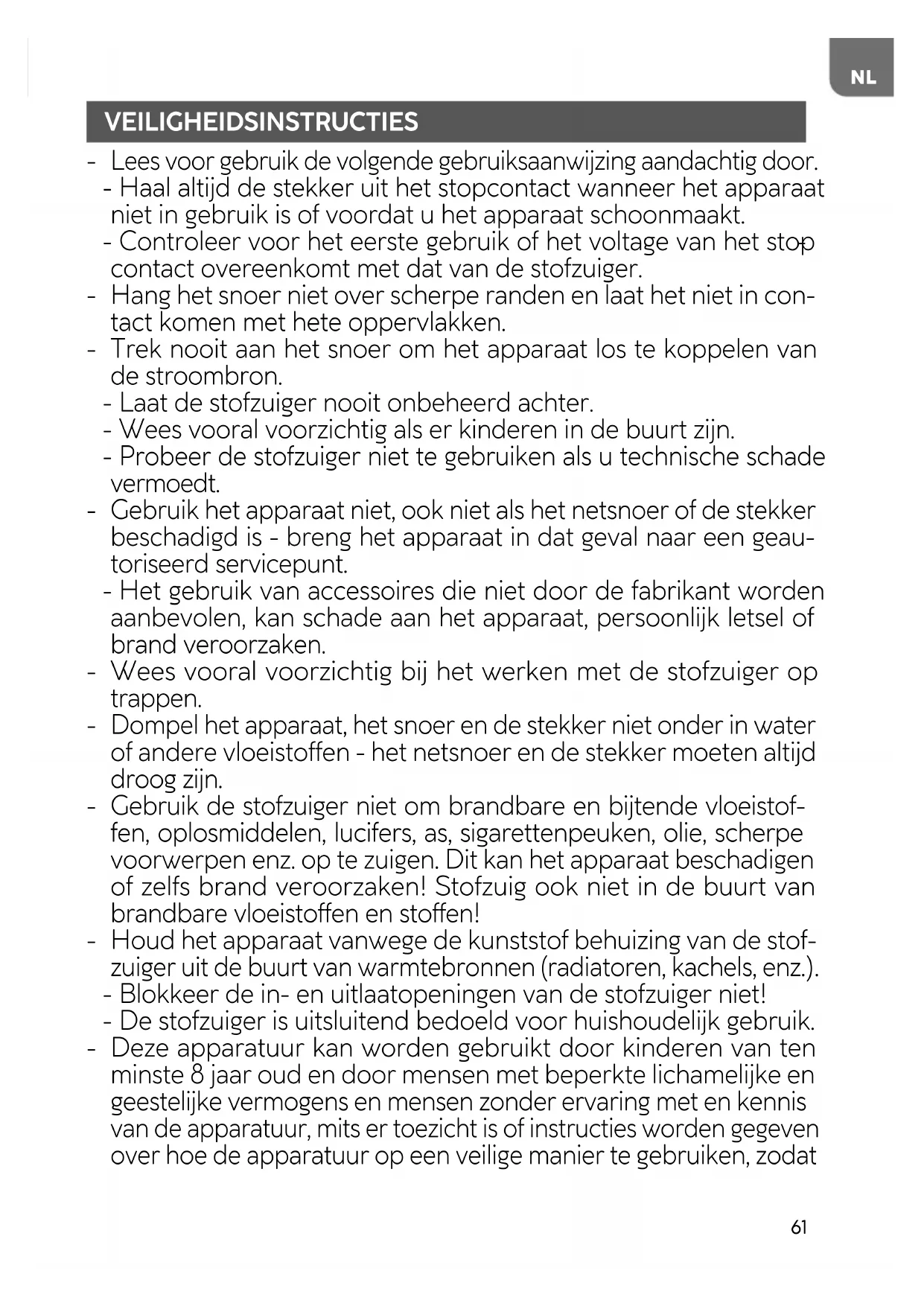 Trek nooit aan het snoer om het apparaat los te koppelen van de stroombron. - Laat de stofzuiger nooit onbeheerd achter. - Wees vooral voorzichtig als er kinderen in de buurt zijn. - Probeer de stofzuiger niet te gebruiken als u technische schade vermoedt.