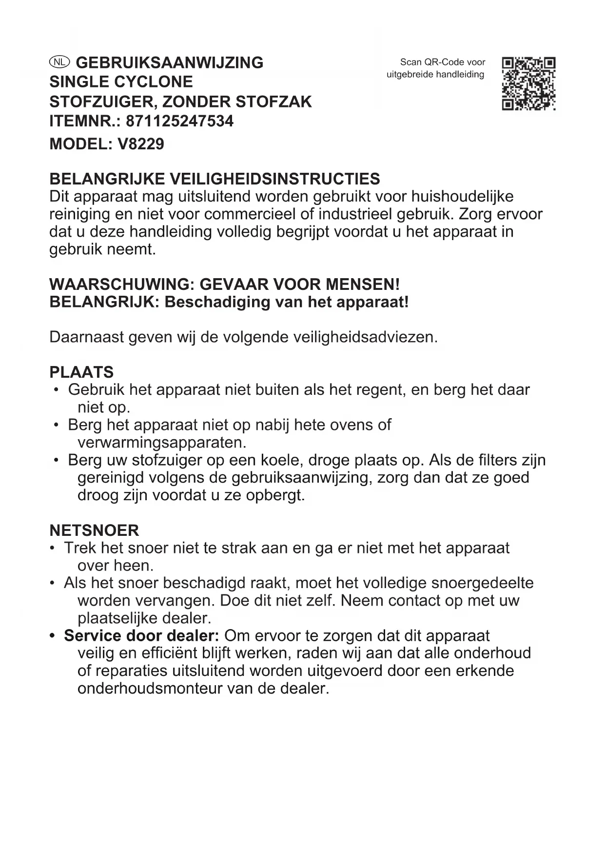 ITEMNR.: 871125247534 MODEL: V8229 BELANGRIJKE VEILIGHEIDSINSTRUCTIES Dit apparaat mag uitsluitend worden gebruikt voor huishoudelijke reiniging en niet voor commercieel of industrieel gebruik. Zorg ervoor dat u deze handleiding volledig begrijpt voordat u het apparaat in gebruik neemt. WAARSCHUWING: GEVAAR VOOR MENSEN! BELANGRIJK: Beschadiging van het apparaat! Daarnaast geven wij de volgende veiligheidsadviezen. PLAATS