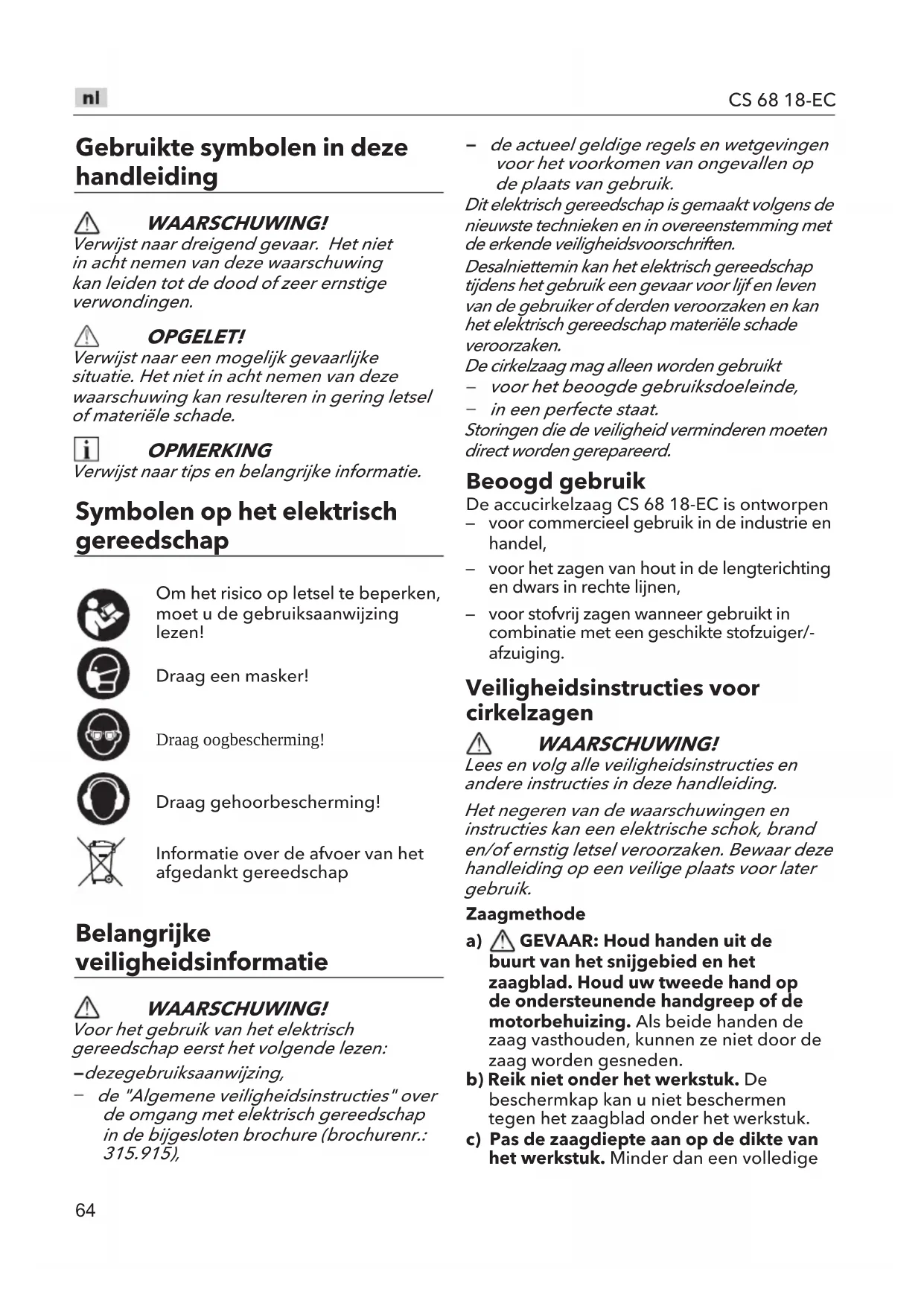 GEVAAR: Houd handen uit de buurt van het snijgebied en het zaagblad. Houd uw tweede hand op de ondersteunende handgreep of de motorbehuizing. Als beide handen de zaag vasthouden, kunnen ze niet door de zaag worden gesneden.b) Reik niet onder het werkstuk. De beschermkap kan u niet beschermen tegen het zaagblad onder het werkstuk.c) Pas de zaagdiepte aan op de dikte van het werkstuk. Minder dan een volledige65 CS 68 18-EC tand van de tanden van het zaagblad zouden zichtbaar moeten zijn onder het werkstuk. d) Houd het werkstuk nooit in uw handen of over uw been tijdens het zagen. Bevestig het werkstuk op een stabiel platform. Het is belangrijk om het werk goed te ondersteunen om blootstelling van het lichaam, het vastlopen van het zaagblad of verlies van controle te minimaliseren. e) Houd het elektrisch gereedschap vast aan de geïsoleerde grepen, als u een handeling uitvoert waarbij het zaaggereedschap in contact kan komen met verborgen bedrading of zijn eigen kabel. Door contact met een onder stroom staande draad kunnen de blootgestelde metalen onderdelen van het elektrisch gereedschap ook onder stroom komen te staan en de gebruiker een elektrische schok geven. f) Gebruik bij het maken van langszaagsneden altijd een breedtegeleider of rechte hoekgeleider. Dit verbetert de zaagnauwkeurigheid en vermindert de kans op vastlopen van het zaagblad. g) Gebruik altijd zaagbladen met de juiste grootte en vorm (diamant vs. rond) of asgaten. Zaagbladen die niet passen op het bevestigingsmateriaal van de zaag lopen niet excentrisch, wat een verlies van controle tot gevolg heeft. h) Gebruik nooit beschadigde of verkeerde sluitringen of bouten. De sluitringen en bout zijn speciaal ontworpen voor uw zaag, voor optimale prestaties en een veilig gebruik. Oorzaken voor een terugslag en gerelateerde waarschuwingen