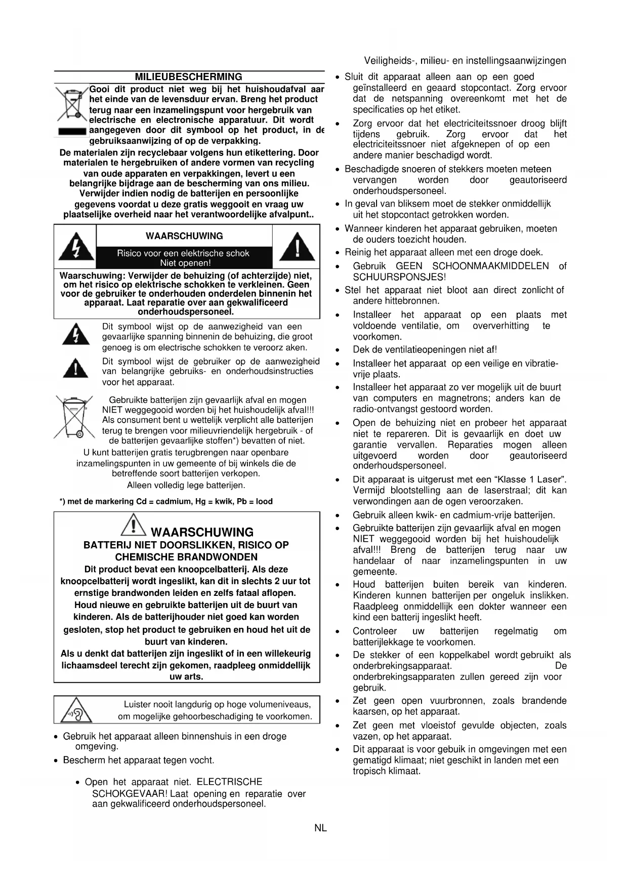 U kunt batterijen gratis terugbrengen naar openbare inzamelingspunten in uw gemeente of bij winkels die de betreffende soort batterijen verkopen. Alleen volledig lege batterijen. *) met de markering Cd = cadmium, Hg = kwik, Pb = lood