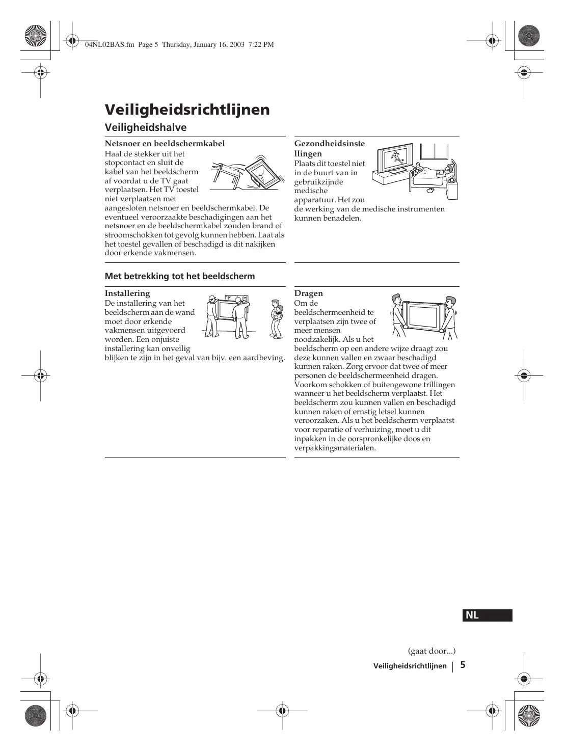 Inhoudsopgave 04NL02BAS.fm Page 5 Thursday, January 16, 2003 7:22 PM Veiligheidsrichtlijnen Veiligheidshalve Netsnoer en beeldschermkabel Haal de stekker uit het stopcontact en sluit de kabel van het beeldscherm af voordat u de TV gaat verplaatsen. Het TV toestel niet verplaatsen met aangesloten netsnoer en beeldschermkabel. De eventueel veroorzaakte beschadigingen aan het netsnoer en de beeldschermkabel zouden brand of stroomschokken tot gevolg kunnen hebben. Laat als het toestel gevallen of beschadigd is dit nakijken door erkende vakmensen. Gezondheidsinste llingen Plaats dit toestel niet in de buurt van in gebruikzijnde medische apparatuur. Het zou de werking van de medische instrumenten kunnen benadelen. Met betrekking tot het beeldscherm Installering Dragen De installering van het beeldscherm aan de wand moet door erkende vakmensen uitgevoerd worden. Een onjuiste installering kan onveilig blijken te zijn in het geval van bijv. een aardbeving. Om de beeldschermeenheid te verplaatsen zijn twee of meer mensen noodzakelijk. Als u het beeldscherm op een andere wijze draagt zou deze kunnen vallen en zwaar beschadigd kunnen raken. Zorg ervoor dat twee of meer personen de beeldschermeenheid dragen. Voorkom schokken of buitengewone trillingen wanneer u het beeldscherm verplaatst. Het beeldscherm zou kunnen vallen en beschadigd kunnen raken of ernstig letsel kunnen veroorzaken. Als u het beeldscherm verplaatst voor reparatie of verhuizing, moet u dit inpakken in de oorspronkelijke doos en verpakkingsmaterialen.