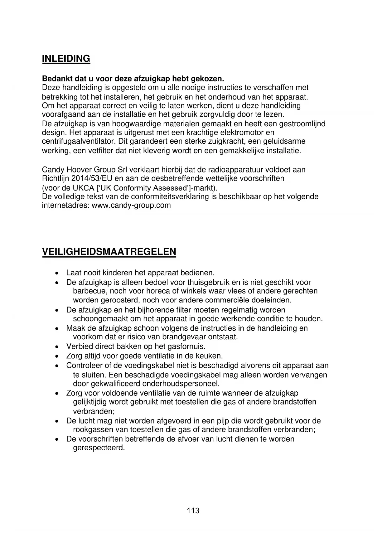 112INLEIDING Bedankt dat u voor deze afzuigkap hebt gekozen. Deze handleiding is opgesteld om u alle nodige instructies te verschaffen met betrekking tot het installeren, het gebruik en het onderhoud van het apparaat. Om het apparaat correct en veilig te laten werken, dient u deze handleiding voorafgaand aan de installatie en het gebruik zorgvuldig door te lezen. De afzuigkap is van hoogwaardige materialen gemaakt en heeft een gestroomlijnd design. Het apparaat is uitgerust met een krachtige elektromotor en centrifugaalventilator. Dit garandeert een sterke zuigkracht, een geluidsarme werking, een vetfilter dat niet kleverig wordt en een gemakkelijke installatie. Candy Hoover Group Srl verklaart hierbij dat de radioapparatuur voldoet aan Richtlijn 2014/53/EU en aan de desbetreffende wettelijke voorschriften (voor de UKCA [‘UK Conformity Assessed’]-markt). De volledige tekst van de conformiteitsverklaring is beschikbaar op het volgende internetadres: www.candy-group.com VEILIGHEIDSMAATREGELEN