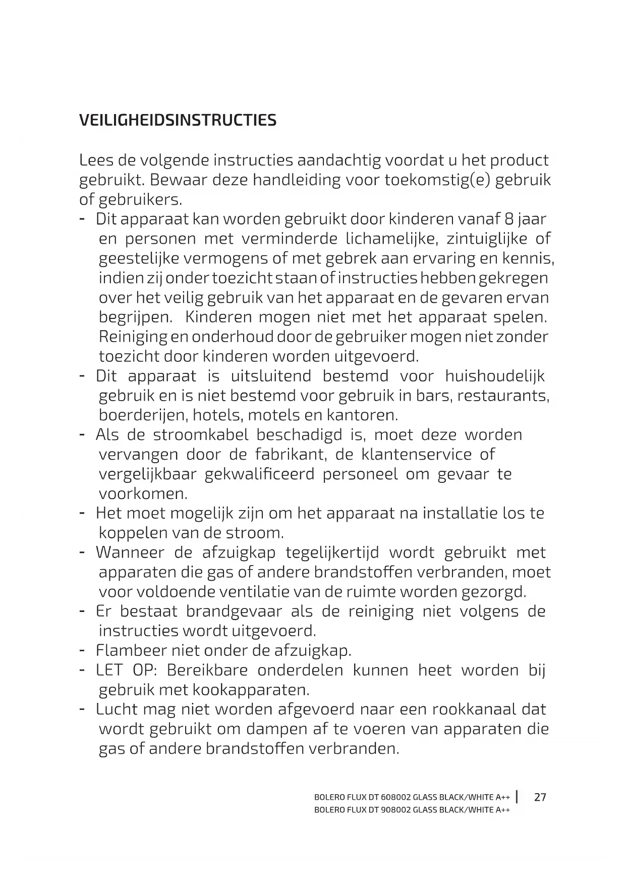 oververhitte vetten of oliën kunnen vlam vatten. - Ophoping van vet in de afzuigkap kan brand veroorzaken. Reinig het apparaat volgens de instructies in deze handleiding. - Wees uiterst voorzichtig bij het reinigen van het apparaat. Risico op brandwonden en/of snijwonden. We raden het gebruik van handschoenen aan. - Laat nooit open vuur onder de afzuigkap. - Probeer de afzuigkap niet te gebruiken als deze beschadigd is. - Wanneer de afzuigkap en andere niet-elektrisch aangedreven apparaten gelijktijdig in werking zijn, mag de onderdruk in de ruimte niet hoger zijn dan 4 Pa (4 x 10-5 bar).29 BOLERO FLUX DT 608002 GLASS BLACK/WHITE A++ BOLERO FLUX DT 908002 GLASS BLACK/WHITE A++ - Belangrijk! Koppel de voeding altijd los tijdens installatie en onderhoud. - De afzuigkap moet worden geïnstalleerd volgens de installatie-instructies en met inachtneming van alle afmetingen. - Alle installatiewerkzaamheden moeten worden uitgevoerd door een bevoegd persoon of een gekwaliceerde elektricien. - Gooi het verpakkingsmateriaal zorgvuldig weg. Kinderen zijn er kwetsbaar voor. - Let op scherpe randen in de afzuigkap, vooral tijdens installatie en reiniging. - Zorg ervoor dat het kanaal geen bochten heeft die scherper zijn dan 90 graden, omdat dit de eciëntie van de afzuigkap vermindert. - Waarschuwing: Als de schroeven of het bevestigingsapparaat niet volgens deze instructies worden geïnstalleerd, kan dit leiden tot elektrische gevaren. - Waarschuwing: Voordat u bij de elektrische aansluitklemmen kunt komen, moeten alle stroomcircuits worden losgekoppeld. - Wanneer de afzuigkap tegelijkertijd met gas- of andere brandstofbranders wordt gebruikt, moet voor voldoende ventilatie van de ruimte worden gezorgd. - Let op: Het apparaat en de toegankelijke onderdelen kunnen heet worden tijdens gebruik. Raak de bereikbare onderdelen niet aan. Kinderen jonger dan 8 jaar moeten uit de buurt blijven, tenzij ze onder voortdurend toezicht staan. - De plaatselijke voorschriften voor luchtafvoer moeten worden nageleefd. - Gebruik om veiligheidsredenen alleen de meegeleverde bevestigings- of montageschroeven (indien van toepassing, afhankelijk van het model) of schroeven van dezelfde grootte als die in deze handleiding worden aanbevolen.30 BOLERO FLUX DT 608002 GLASS BLACK/WHITE A++ BOLERO FLUX DT 908002 GLASS BLACK/WHITE A++ - Gebruik geen stoomreiniger. - Probeer een brand nooit met water te blussen, maar schakel het apparaat uit en dek de vlam vervolgens af, bijvoorbeeld met een brandvertragende hoes of deken. - Gebruik nooit verlengkabels, stekkerdozen of externe timeraansluitingen. - Als de kabel beschadigd is, moet deze vervangen worden door de technische dienst van Cecotec of gelijksoortige gekwaliceerde technici om gevaar te voorkomen. - Het apparaat mag niet worden gebruikt als het netsnoer beschadigd of doorgesneden is. - Als het apparaat niet meer werkt of abnormaal functioneert, haal dan de stekker uit het stopcontact en neem contact op met de technische dienst van Cecotec. - Cecotec wijst alle aansprakelijkheid af voor schade of letsel veroorzaakt door het niet opvolgen van de installatie- en/of bedieningsinstructies in deze handleiding.31 BOLERO FLUX DT 608002 GLASS BLACK/WHITE A++ BOLERO FLUX DT 908002 GLASS BLACK/WHITE A++