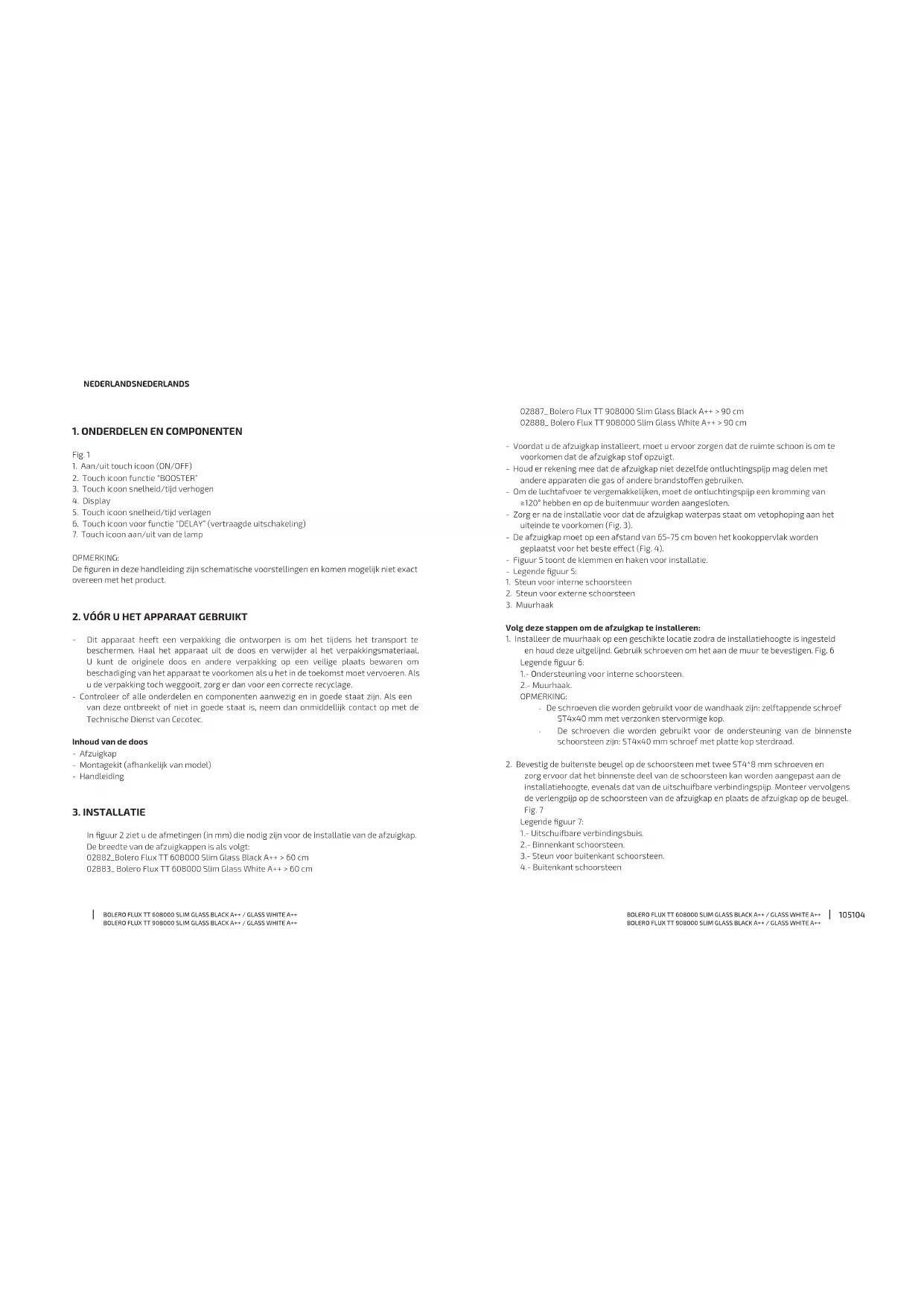 of als het lter overmatig vuil of vet is! Se o cabo de alimentação estiver danicado, deve ser substituído pelo Serviço de Assistência Técnica da Cecotec ou por pessoal qualicado, a m de evitar um perigo. O aparelho não deve ser utilizado se o cabo de alimentação elétrica estiver danicado, danicado, danicado ou cortado. Se o aparelho deixar de funcionar ou apresentar um funcionamento anormal, desligue-o da rede elétrica e contacte o Serviço de Assistência Técnica Cecotec. A Cecotec não assume qualquer responsabilidade por quaisquer danos ou ferimentos causados pelo incumprimento das instruções de instalação e/ou de funcionamento contidas neste manual de instruções. VEILIGHEIDSINSTRUCTIES Lees de volgende instructies aandachtig voordat u het product gebruikt. Bewaar deze handleiding voor toekomstig(e) gebruik of gebruikers. Dit apparaat kan worden gebruikt door kinderen vanaf 8 jaar en personen met verminderde lichamelijke, zintuiglijke of geestelijke vermogens of met gebrek aan ervaring en kennis, indien zij onder toezicht staan of instructies hebben gekregen over het veilig gebruik van het apparaat en de gevaren ervan begrijpen. Kinderen mogen niet met het apparaat spelen. Reiniging en onderhoud door de gebruiker mogen niet zonder toezicht door kinderen worden uitgevoerd. Dit apparaat is uitsluitend bestemd voor huishoudelijk gebruik en is niet bestemd voor gebruik in bars, restaurants, boerderijen, hotels, motels en kantoren. Als de stroomkabel beschadigd is, moet deze worden vervangen door de fabrikant, de klantenservice of3130 BOLERO FLUX TT 608000 SLIM GLASS BLACK A++ / GLASS WHITE A++ BOLERO FLUX TT 908000 SLIM GLASS BLACK A++ / GLASS WHITE A++ BOLERO FLUX TT 608000 SLIM GLASS BLACK A++ / GLASS WHITE A++ BOLERO FLUX TT 908000 SLIM GLASS BLACK A++ / GLASS WHITE A++ Waarschuwing: Voordat u bij de elektrische aansluitklemmen kunt komen, moeten alle stroomcircuits worden losgekoppeld. Wanneer de afzuigkap tegelijkertijd met gas- of andere brandstofbranders wordt gebruikt, moet voor voldoende ventilatie van de ruimte worden gezorgd. Let op: Het apparaat en de toegankelijke onderdelen kunnen heet worden tijdens gebruik. Raak de bereikbare onderdelen niet aan. Kinderen jonger dan 8 jaar moeten uit de buurt blijven, tenzij ze onder voortdurend toezicht staan. De plaatselijke voorschriften voor luchtafvoer moeten worden nageleefd. Gebruik om veiligheidsredenen alleen de meegeleverde bevestigings- of montageschroeven (indien van toepassing, afhankelijk van het model) of schroeven van dezelfde grootte als die in deze handleiding worden aanbevolen. Gebruik geen stoomreiniger. Probeer een brand nooit met water te blussen, maar schakel het apparaat uit en dek de vlam vervolgens af, bijvoorbeeld met een vlamvertragende hoes of deken. Gebruik nooit verlengkabels, stekkerdozen of externe timeraansluitingen. Als de kabel beschadigd is, moet deze vervangen worden door de technische dienst van Cecotec of gelijksoortige gekwaliceerde technici om gevaar te voorkomen. Het apparaat mag niet worden gebruikt als het netsnoer beschadigd of doorgesneden is. Als het apparaat niet meer werkt of abnormaal functioneert, haal dan de stekker uit het stopcontact en neem contact op met de technische dienst van Cecotec. Cecotec wijst alle aansprakelijkheid af voor schade of letsel veroorzaakt door het niet opvolgen van de installatie- en/of bedieningsinstructies in deze handleiding.