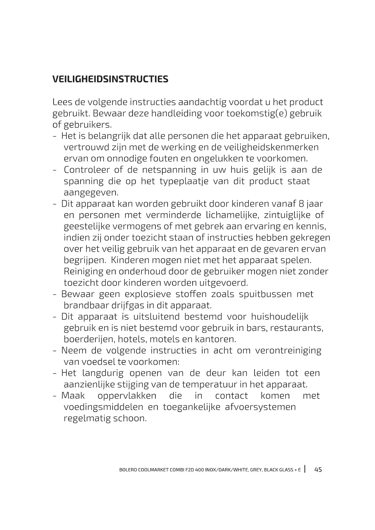 Ventile completamente o quarto onde se encontrar o aparelho.45 BOLERO COOLMARKET COMBI F2D 400 INOX/DARK/WHITE, GREY, BLACK GLASS + E VEILIGHEIDSINSTRUCTIES Lees de volgende instructies aandachtig voordat u het product gebruikt. Bewaar deze handleiding voor toekomstig(e) gebruik of gebruikers. - Het is belangrijk dat alle personen die het apparaat gebruiken, vertrouwd zijn met de werking en de veiligheidskenmerken ervan om onnodige fouten en ongelukken te voorkomen. - Controleer of de netspanning in uw huis gelijk is aan de spanning die op het typeplaatje van dit product staat aangegeven. - Dit apparaat kan worden gebruikt door kinderen vanaf 8 jaar en personen met verminderde lichamelijke, zintuiglijke of geestelijke vermogens of met gebrek aan ervaring en kennis, indien zij onder toezicht staan of instructies hebben gekregen over het veilig gebruik van het apparaat en de gevaren ervan begrijpen. Kinderen mogen niet met het apparaat spelen. Reiniging en onderhoud door de gebruiker mogen niet zonder toezicht door kinderen worden uitgevoerd. - Bewaar geen explosieve stoen zoals spuitbussen met brandbaar drijfgas in dit apparaat. - Dit apparaat is uitsluitend bestemd voor huishoudelijk gebruik en is niet bestemd voor gebruik in bars, restaurants, boerderijen, hotels, motels en kantoren. - Neem de volgende instructies in acht om verontreiniging van voedsel te voorkomen: - Het langdurig openen van de deur kan leiden tot een aanzienlijke stijging van de temperatuur in het apparaat. - Maak oppervlakken die in contact komen met voedingsmiddelen en toegankelijke afvoersystemen regelmatig schoon.46 BOLERO COOLMARKET COMBI F2D 400 INOX/DARK/WHITE, GREY, BLACK GLASS + E - Als de vriezer langere tijd leeg blijft, schakel hem dan uit door hem te ontdooien, schoon te maken, te drogen en de deur open te laten om schimmelvorming in het apparaat te voorkomen. - WAARSCHUWING: let er bij het plaatsen van het apparaat op dat het netsnoer niet bekneld of beschadigd raakt. Een verbrijzelde of beschadigde connector kan heet worden en brand veroorzaken. - Zorg ervoor dat u na de installatie bij de hoofdstekker van het apparaat kunt. - WAARSCHUWING: bevestig geen stekkerdozen met meerdere stekkers of meerdere voedingen aan de achterkant van het apparaat. - WAARSCHUWING: Houd de ventilatieroosters van de behuizing van het apparaat of de kast waarin het apparaat staat vrij. - WAARSCHUWING: gebruik geen mechanische apparaten of andere middelen om het ontdooiproces te versnellen die niet door Cecotec worden aanbevolen. - WAARSCHUWING: gebruik geen elektrische apparaten in de koelkast. - WAARSCHUWING: beschadig het koelcircuit niet. - Als de kabel beschadigd is, moet hij door de fabrikant, de distributeur of soortgelijk gekwaliceerd personeel worden vervangen om gevaar te voorkomen. - Wij raden aan het netsnoer regelmatig te controleren op eventuele tekenen van beschadiging; gebruik het apparaat niet als het snoer beschadigd is. - WAARSCHUWING: om risico’s als gevolg van instabiliteit van de koelkast te voorkomen, moet deze volgens de instructies worden geïnstalleerd.47 BOLERO COOLMARKET COMBI F2D 400 INOX/DARK/WHITE, GREY, BLACK GLASS + E - WAARSCHUWING! Het is gevaarlijk voor iemand anders dan bevoegd personeel om onderhoud of reparaties uit te voeren waarbij afdekkingen moeten worden verwijderd. Probeer het apparaat niet zelf te repareren om het risico van een elektrische schok te vermijden. - Plaats geen koolzuurhoudende dranken in het vriesvak. Stokken kunnen “vriesbrand” veroorzaken. Dit kan gebeuren als ze worden ingeslikt nadat ze uit de vriezer zijn gehaald. - Haal geen artikelen uit de vriezer met natte handen, omdat dit kan leiden tot schaafwonden of “vriesbrandwonden”. Flessen en blikjes mogen niet in de vriezer, omdat zij kunnen barsten wanneer de inhoud bevriest. - Bevroren voedsel kan vriesbrand veroorzaken als het onmiddellijk na verwijdering uit de vriezer wordt geconsumeerd. - Neem de door de fabrikant aanbevolen opslagtijden in acht. - Laat kinderen niet met de bedieningselementen knoeien of met de koelkast spelen. De koelkast is een zwaar apparaat. Wees voorzichtig bij het verplaatsen of vervoeren. Het is gevaarlijk de specicaties te wijzigen of te proberen dit product op enigerlei wijze aan te passen. - WAARSCHUWING: Deuren of deksels met sloten en sleutels moeten buiten het bereik van kinderen en niet in de buurt van de vriezer worden gehouden om te voorkomen dat kinderen binnenin worden opgesloten. - WAARSCHUWING: het in uw apparaat gebruikte koelmiddel en de isolatiematerialen moeten op de juiste wijze worden afgevoerd. - Houd verpakkingsmateriaal buiten het bereik van kinderen, aangezien er verstikkingsgevaar bestaat. - WAARSCHUWING: als de binnenverlichting beschadigd is, neem dan contact op met de Technische Dienst van Cecotec. Probeer het niet zelf te repareren.48 BOLERO COOLMARKET COMBI F2D 400 INOX/DARK/WHITE, GREY, BLACK GLASS + E - Zorg ervoor dat u na de installatie bij de hoofdstekker van het apparaat kunt. - Plaats geen voedsel direct tegen de luchtuitlaat in het apparaat. - Zet geen warme levensmiddelen of dranken in de koelkast, laat ze eerst afkoelen tot kamertemperatuur. - Dit apparaat heeft een ingebouwde geaarde stekker. Zorg ervoor dat het stopcontact in uw huis goed geaard is. - Houd de ventilatieopeningen van het product vrij van obstructies. - Wacht na een stroomonderbreking 5 minuten alvorens het apparaat weer in te schakelen. Anders kan de compressor beschadigd raken. - Plaats geen koolzuurhoudende of bruisende dranken in de vriezer, omdat dit druk veroorzaakt, het kan exploderen en het apparaat kan beschadigen. - Om letsel of de dood door elektrische schokken te voorkomen, mag u het apparaat niet bedienen met natte handen of op een nat oppervlak. - Deze koelkast mag niet worden gebruikt met een verlengsnoer of een stekkerdoos. Zorg ervoor dat de stekker van het apparaat rechtstreeks in het stopcontact zit. - Bij het plaatsen van het apparaat moet u ervoor zor