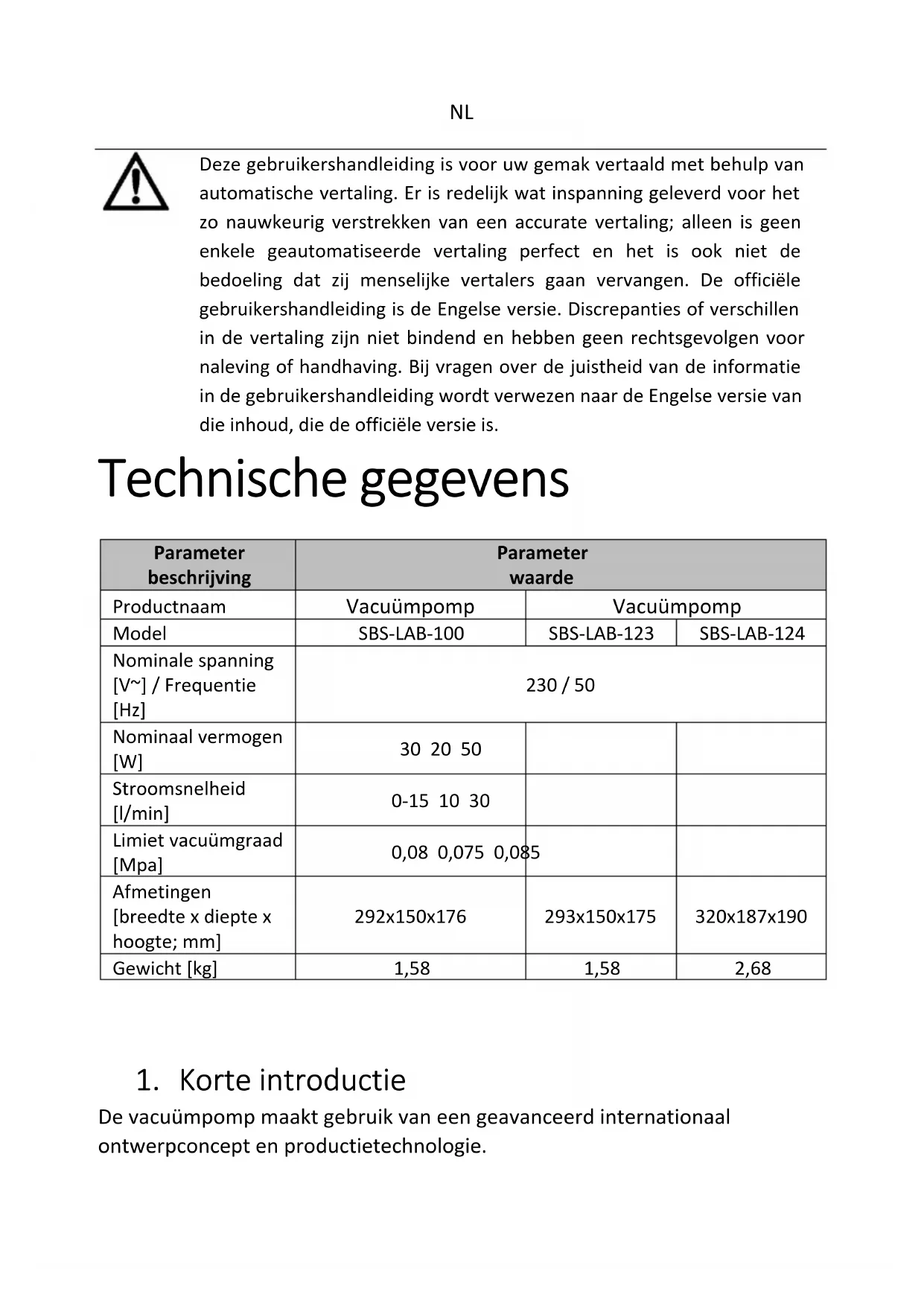 Deze gebruikershandleiding is voor uw gemak vertaald met behulp van automatische vertaling. Er is redelijk wat inspanning geleverd voor het zo nauwkeurig verstrekken van een accurate vertaling; alleen is geen enkele geautomatiseerde vertaling perfect en het is ook niet de bedoeling dat zij menselijke vertalers gaan vervangen. De officiële gebruikershandleiding is de Engelse versie. Discrepanties of verschillen in de vertaling zijn niet bindend en hebben geen rechtsgevolgen voor naleving of handhaving. Bij vragen over de juistheid van de informatie in de gebruikershandleiding wordt verwezen naar de Engelse versie van die inhoud, die de officiële versie is. Technische gegevens Parameter beschrijving Parameter waarde Productnaam Vacuümpomp Vacuümpomp Model SBS-LAB-100 SBS-LAB-123 SBS-LAB-124 Nominale spanning [V~] / Frequentie [Hz] 230 / 50 Nominaal vermogen [W]