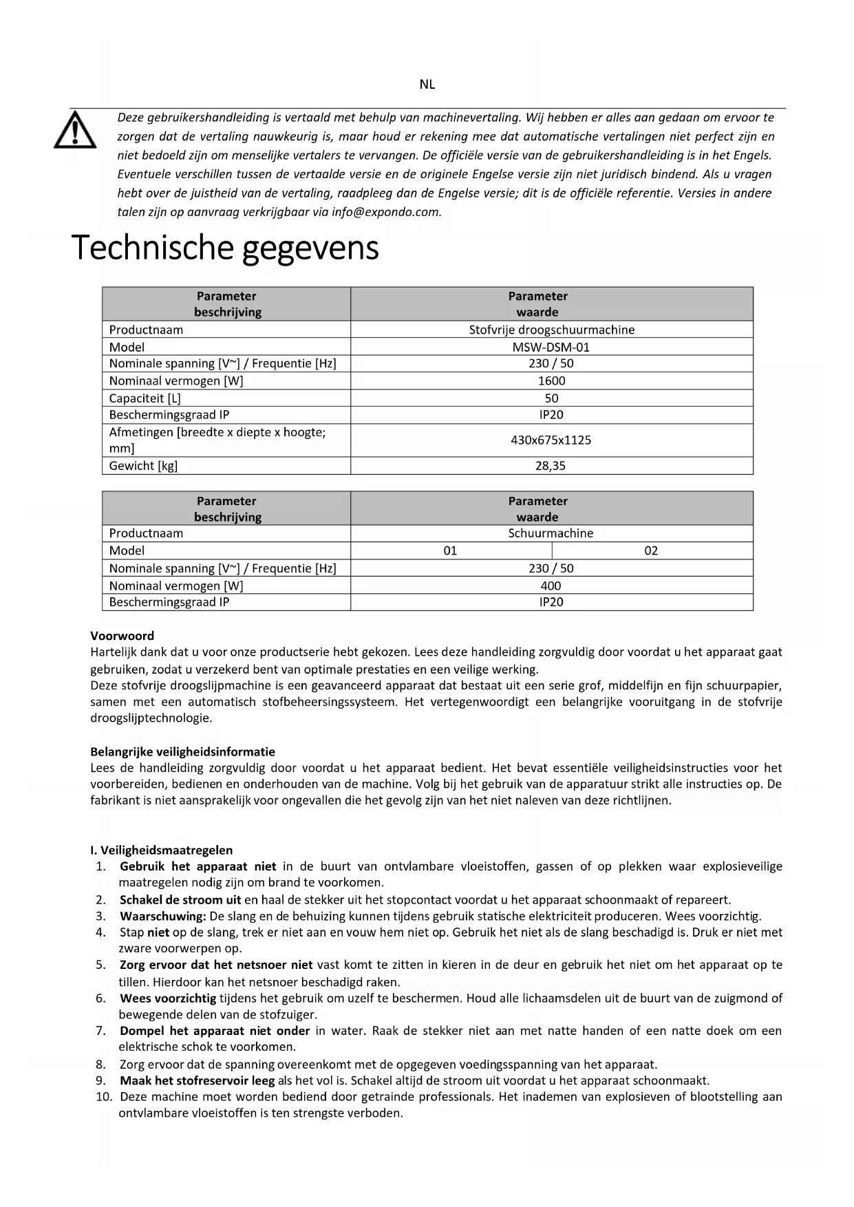 Deze gebruikershandleiding is vertaald met behulp van machinevertaling. Wij hebben er alles aan gedaan om ervoor te zorgen dat de vertaling nauwkeurig is, maar houd er rekening mee dat automatische vertalingen niet perfect zijn en niet bedoeld zijn om menselijke vertalers te vervangen. De officiële versie van de gebruikershandleiding is in het Engels. Eventuele verschillen tussen de vertaalde versie en de originele Engelse versie zijn niet juridisch bindend. Als u vragen hebt over de juistheid van de vertaling, raadpleeg dan de Engelse versie; dit is de officiële referentie. Versies in andere talen zijn op aanvraag verkrijgbaar via info@expondo.com. Technische gegevens Parameter beschrijving Parameter waarde Productnaam Stofvrije droogschuurmachine Model MSW-DSM-01 Nominale spanning [V~] / Frequentie [Hz] 230 / 50 Nominaal vermogen [W]