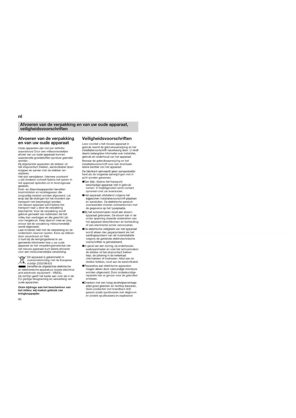 Afvoeren van de verpakking en van uw oude apparaat, veiligheidsvoorschriften Afvoeren van de verpakking en van uw oude apparaat Oude apparaten zijn niet per definitie waardeloos! Door een milieuvriendelijke afvoer van uw oude apparaat kunnen waardevolle grondstoffen opnieuw gebruikt worden. Bij afgedankte apparaten de stekker uit het stopcontact trekken, aansluitkabel door- knippen en samen met de stekker ver- wijderen. Het slot verwijderen. Hiermee voorkomt u dat kinderen zichzelf tijdens het spelen in het apparaat opsluiten en in levensgevaar geraken. Koel- en diepvriesapparaten bevatten koelmiddelen en isolatiegassen die zorgvuldig moeten worden afgevoerd. Let erop dat de leidingen tot het moment van transport niet beschadigd worden. Uw nieuwe apparaat werd tijdens het transport naar u door de verpakking beschermd. Voor de verpakking wordt gebruik gemaakt van materialen die het milieu kan verdragen en die geschikt zijn voor hergebruik. Help daarom mee en zorg ervoor dat de verpakking milieuvriendelijk wordt afgevoerd. Laat kinderen niet met de verpakking en de onderdelen daarvan spelen. Kans op stikken door vouwdozen en folie. U kunt bij de reinigingsdienst in uw gemeente informeren hoe u uw oude apparaat en het verpakkingsmateriaal van het nieuwe apparaat kunt (laten) afvoeren voor een milieuvriendelijke verwerking. Dit apparaat is gekenmerkt in overeenstemming met de Europese richtlijn 2002/96/EG betreffende afgedankte elektrische en elektronische apparatuur (waste electrical and electronic equipment - WEEE). De richtlijn geeft het kader aan voor de in de EU geldige terugneming en verwerking van oude apparaten. Onze bijdrage aan het beschermen van het milieu: wij maken gebruik van kringlooppapier. Veiligheidsvoorschriften Lees voordat u het nieuwe apparaat in gebruik neemt de gebruiksaanwijzing en het installatievoorschrift nauwkeurig door. U vindt daarin belangrijke informatie over installatie, gebruik en onderhoud van het apparaat. Bewaar de gebruiksaanwijzing en het installatievoorschrift voor een eventuele latere bezitter van het apparaat. De fabrikant aanvaardt geen aansprakelijk- heid als de volgende aanwijzingen niet in acht worden genomen: ● Een (bijv. tijdens het transport) beschadigd apparaat niet in gebruik nemen. In twijfelgevallen eerst contact opnemen met uw leverancier. ● Het apparaat uitsluitend volgens het bijgesloten installatievoorschrift plaatsen en aansluiten. De elektrische aansluit- voorwaarden moeten overeenkomen met de gegevens op het typeplaatje. ● Bij het schoonmaken nooit een stoom- apparaat gebruiken. De stoom kan in de onder spanning staande onderdelen van het apparaat terechtkomen en kortsluiting of een electrische schok veroorzaken. ● De elektrische veiligheid van het apparaat wordt alleen dan gegarandeerd als het aardingssysteem van de huisinstallatie volgens de geldende elektrotechnische voorschriften is geïnstalleerd. ● In geval van een storing, bij onderhouds- werkzaamheden en vóór het schoonmaken de stekker uit het stopcontact trekken resp. de zekering in de meterkast uitschakelen of losdraaien. Altijd aan de stekker trekken, nooit aan de aansluitkabel. ● Reparaties aan elektrische apparaten mogen alleen door vakkundige monteurs worden uitgevoerd. Door ondeskundige reparatie kan er gevaar voor de gebruiker ontstaan. ● Dranken met een hoog alcoholpercentage altijd goed gesloten en rechtop bewaren. Geen producten met brandbare drijf- gassen (zoals spuitbussen met slagroom en andere spuitbussen) en explosieve81