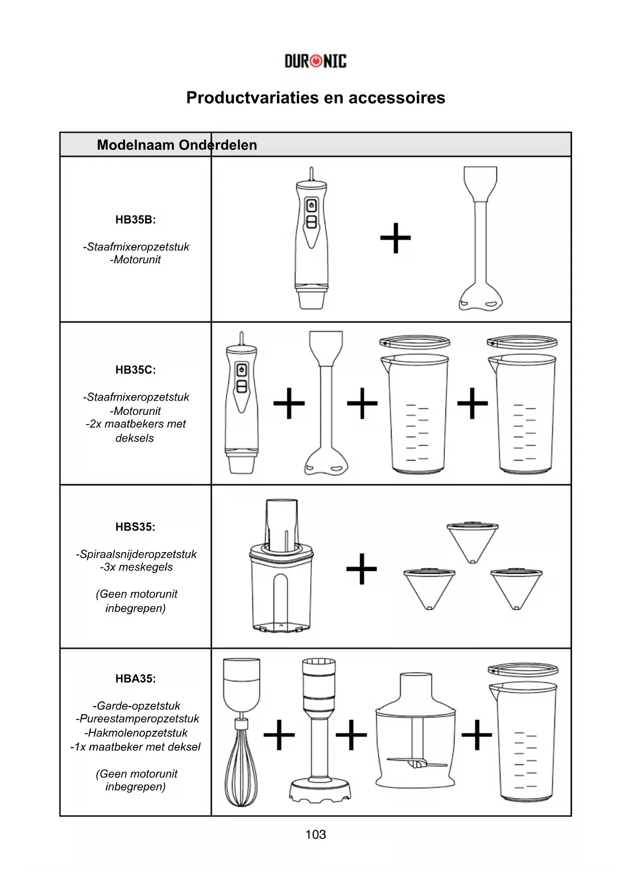 Kabellengte RPM Capaciteit Vermogen Spanning 150cm 59in 13500 RPM Jug: 600ml Hakmolen: 500ml Spiralisator: 1.4L 350W 220-240V 50-60Hz103 Modelnaam Onderdelen HB35B: -Staafmixeropzetstuk -Motorunit HB35C: -Staafmixeropzetstuk -Motorunit -2x maatbekers met deksels HBS35: -Spiraalsnijderopzetstuk -3x meskegels (Geen motorunit inbegrepen) HBA35: -Garde-opzetstuk -Pureestamperopzetstuk -Hakmolenopzetstuk -1x maatbeker met deksel (Geen motorunit inbegrepen) Productvariaties en accessoires104 GELIEVE DEZE HANDLEIDING ZORGVULDIG TE LEZEN EN TE BEWAREN