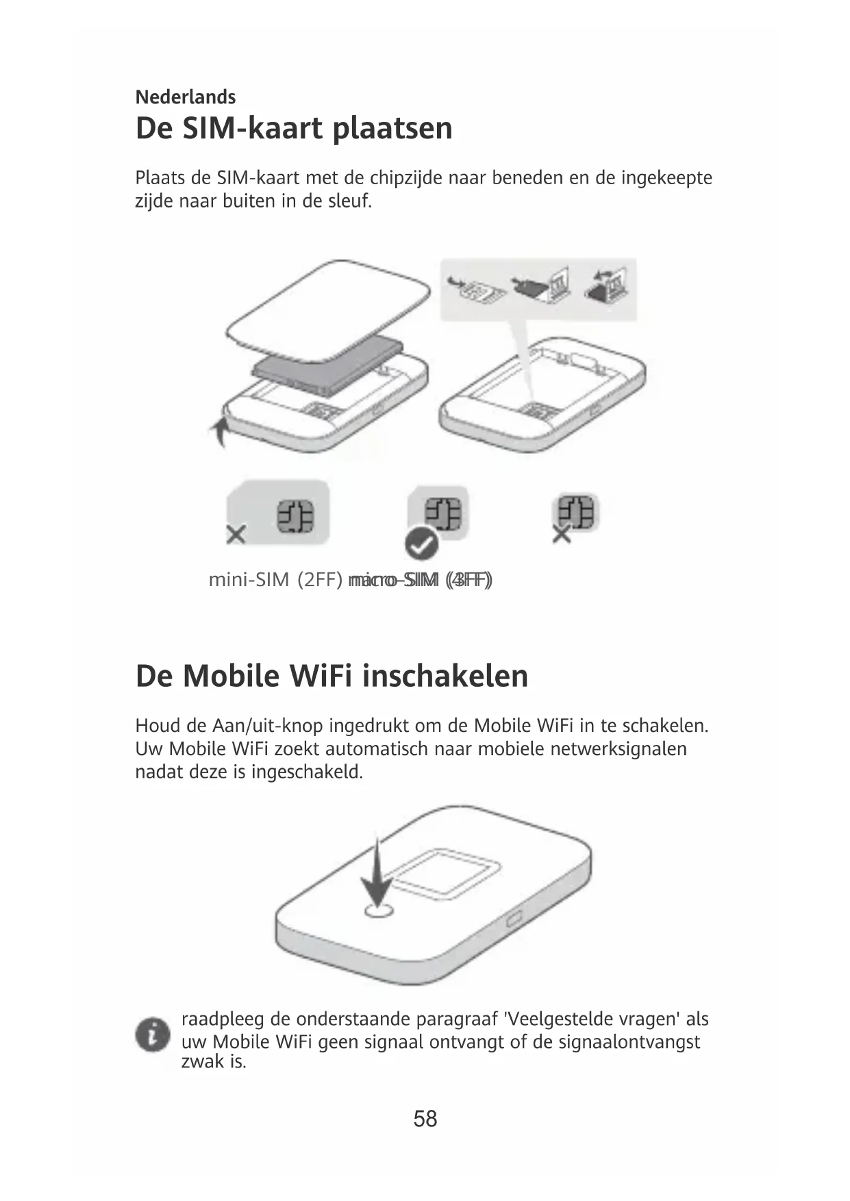 Frequentieband en vermogen (a) Frequentieband waarbinnen de radioapparatuur functioneert: Sommige frequentiebanden zijn niet in alle landen en regio's 70beschikbaar. Neem contact op met uw aanbieder voor meer informatie. (b) Maximaal radiofrequentievermogen uitgezonden in de frequentieband waarbinnen de radioapparatuur functioneert: Het maximale vermogen voor alle frequentieband is minder dan de limietwaarde voor de van toepassing zijnde geharmoniseerde standaard. De nominale limieten van de frequentiebanden en het zendvermogen (uitgestraald en/of geleid) van deze radioapparatuur zijn als volgt: GSM900:35.5dBm, GSM1800:32.5dBm, WCDMA900/2100:25.7dBm, LTE Band 1/3/7/8/20/28/38: 25.7dBm, LTE Band42: 26dBm, Wi-Fi 2.4G:20dBm, Wi-Fi 5G: 5150-5350MHz: 23dBm, 5470-5725MHz: 30dBm. Informatie over accessoires en software Sommige accessoires zijn optioneel in bepaalde landen of regio's. Optionele accessoires kunnen eventueel worden gekocht via een gelicentieerde leverancier. De volgende accessoires worden aanbevolen: Adapters: HW-050200X02 (X houdt in de verschillende soorten stekkers, namelijk C, U, J, E, B, A, I, R, Z of K, afhankelijk van uw regio) Batterijen: HB824666RBC De softwareversie van het product is 10.0.5.1(H170SP7C00). De fabrikant werkt de software bij om fouten in de software te verhelpen of de functionaliteit van het product te verbeteren nadat het product is uitgekomen. Alle versies van de software zijn door de fabrikant gecontroleerd, en voldoen aan alle van toepassing zijnde regels. De RF-parameters (bijvoorbeeld frequentiebereik en zendvermogen) zijn niet toegankelijk voor de gebruiker, en kunnen niet worden gewijzigd door de gebruiker. Ga voor de meest recente informatie over accessoires en software naar de Verklaring van overeenstemming op https:// consumer.huawei.com/certication. Bezoek https://consumer.huawei.com/en/support/hotline voor het actuele nummer en e-mailadres van de hotline in uw land. 71Português Inserir o cartão SIM Insira o cartão SIM na entrada com o lado do chip virado para baixo e o canto cortado virado para fora. micro-SIM (3FF) mini-SIM (2FF) nano-SIM (4FF) Ligar o Mobile WiFi Prima continuamente o botão Ligar para ligar o Mobile WiFi. O seu Mobile WiFi procura automaticamente sinais de rede móvel após ser ligado. Consulte a secção Perguntas frequentes abaixo se o seu Mobile WiFi não receber sinal ou se a receção do sinal for fraca. 72Aceder à Internet Ligue o seu dispositivo ao Mobile WiFi para aceder à Internet. Prima o botão MENU no seu Mobile WiFi para aceder ao ecrã do menu e consultar o nome da rede Wi-Fi