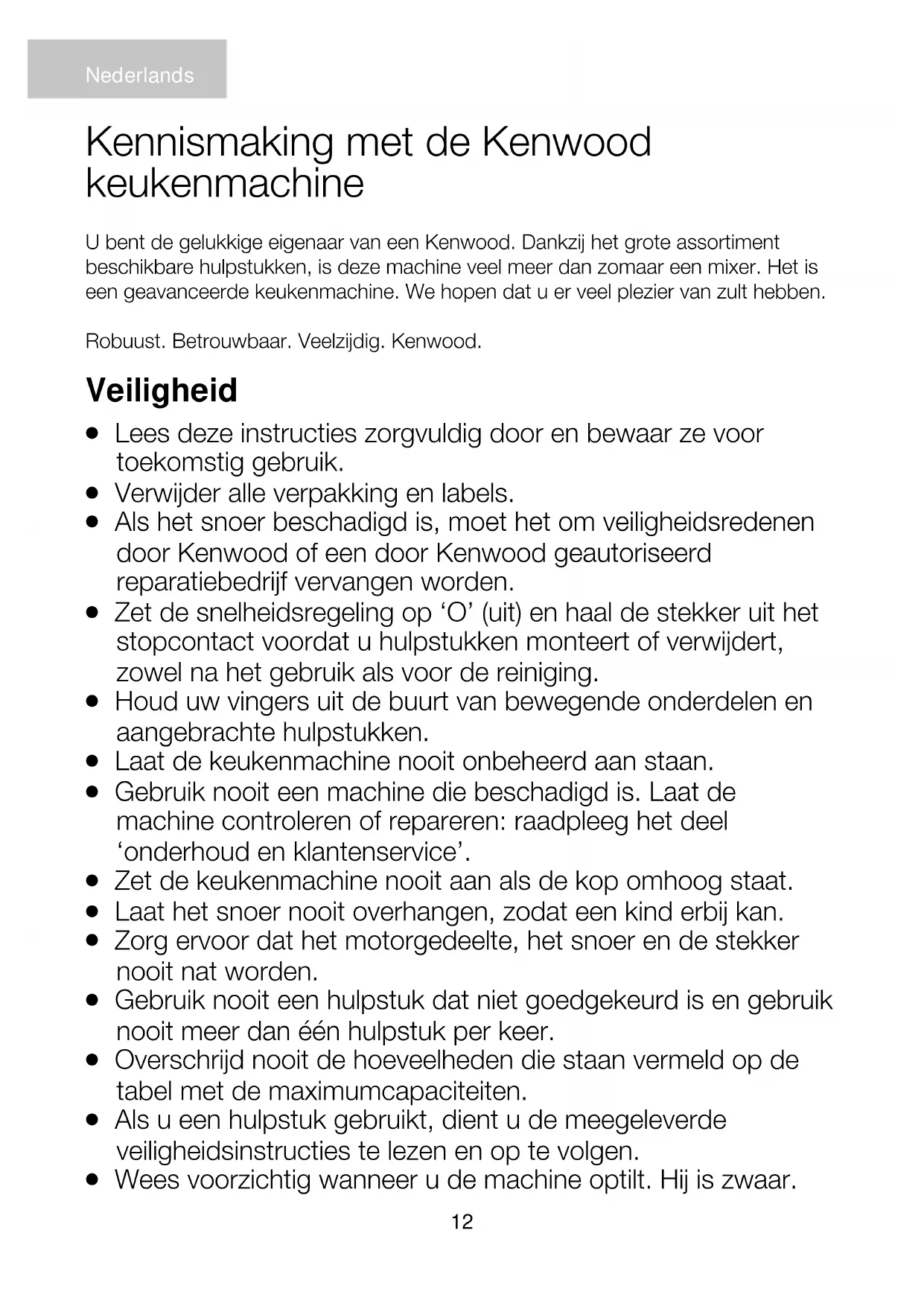 ELEKTRONISCHE APPARATUUR (AEEA) Aan het einde van de levensduur van het product mag het niet samen met het gewone huishoudelijke afval worden verwerkt. Het moet naar een speciaal centrum voor gescheiden afvalinzameling van de gemeente worden gebracht, of naar een verkooppunt dat deze service verschaft. Het apart verwerken van een huishoudelijk apparaat voorkomt mogelijke gevolgen voor het milieu en de gezondheid die door een ongeschikte verwerking ontstaan en zorgt ervoor dat de materialen waaruit het apparaat bestaat, teruggewonnen kunnen worden om een aanmerkelijke besparing van energie en grondstoffen te verkrijgen. Om op de verplichting tot gescheiden verwerking van elektrische huishoudelijke apparatuur te wijzen, is op het product het symbool van een doorgekruiste vuilnisbak aangebracht.22 Découvrez votre robot pâtissier multifonction Kenwood Nous tenons à vous féliciter d’avoir porté votre choix sur un robot Kenwood. Avec un tel éventail d’accessoires, votre robot de cuisine est bien plus qu’un simple robot pâtissier. Vous bénéficiez du robot pâtissier multifonction le plus perfectionné à ce jour. Nous espérons qu’il vous apportera pleine satisfaction. Robuste. Fiable. Polyvalent. Kenwood. Français Sécurité