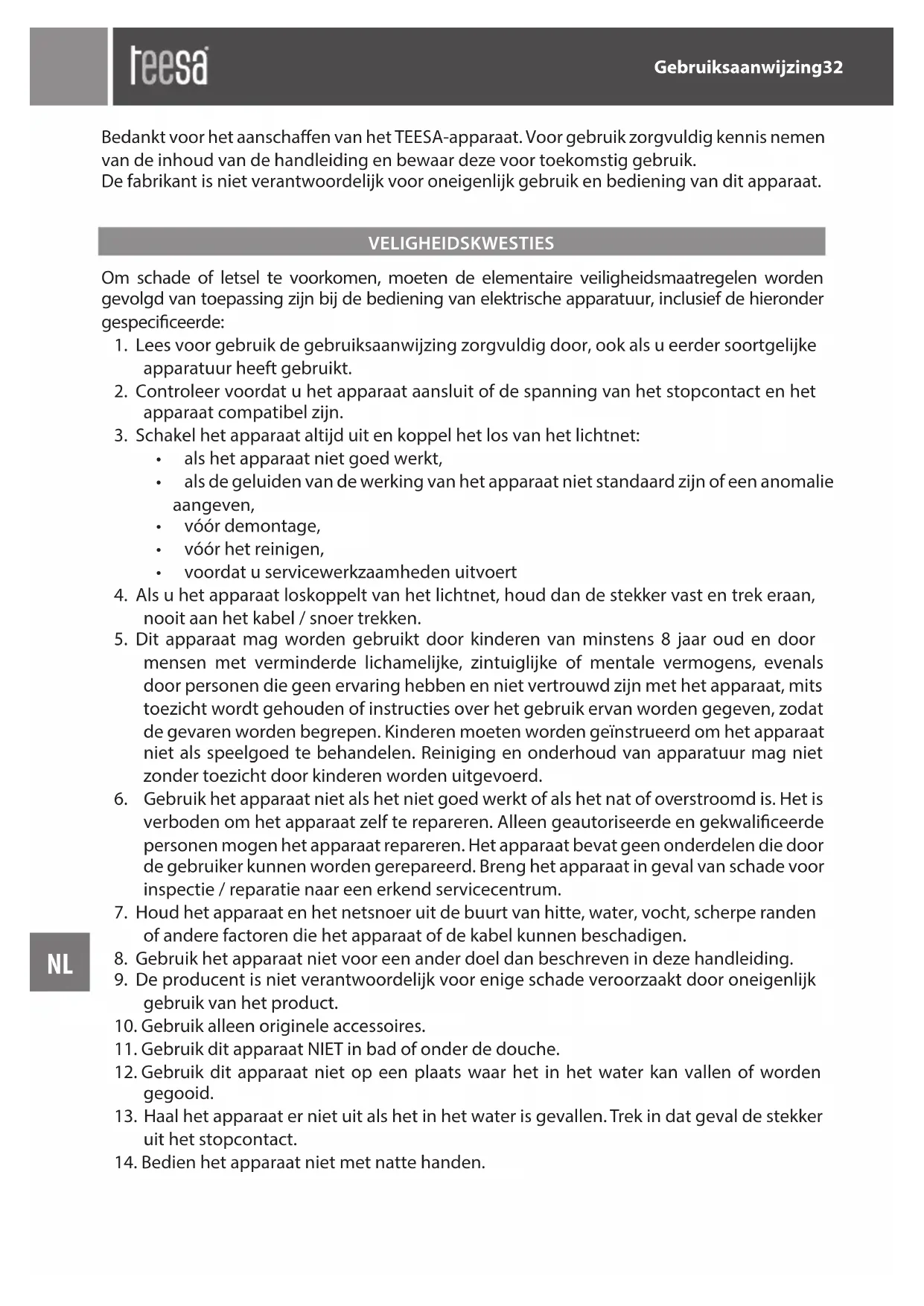 8. Gebruik het apparaat niet voor een ander doel dan beschreven in deze handleiding.