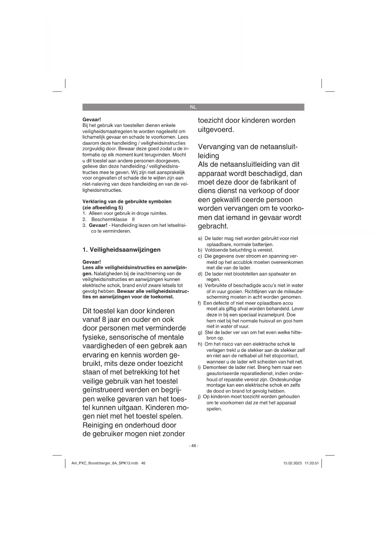 geautoriseerde reparatiedienst, indien onder- houd of reparatie vereist zijn. Ondeskundige montage kan een elektrische schok en zelfs de dood en brand tot gevolg hebben. j) Op kinderen moet toezicht worden gehouden om te voorkomen dat ze met het apparaat spelen. Anl_PXC_Boostcharger_8A_SPK13.indb 46Anl_PXC_Boostcharger_8A_SPK13.indb 46 15.02.2023 11:20:5115.02.2023 11:20:51NL