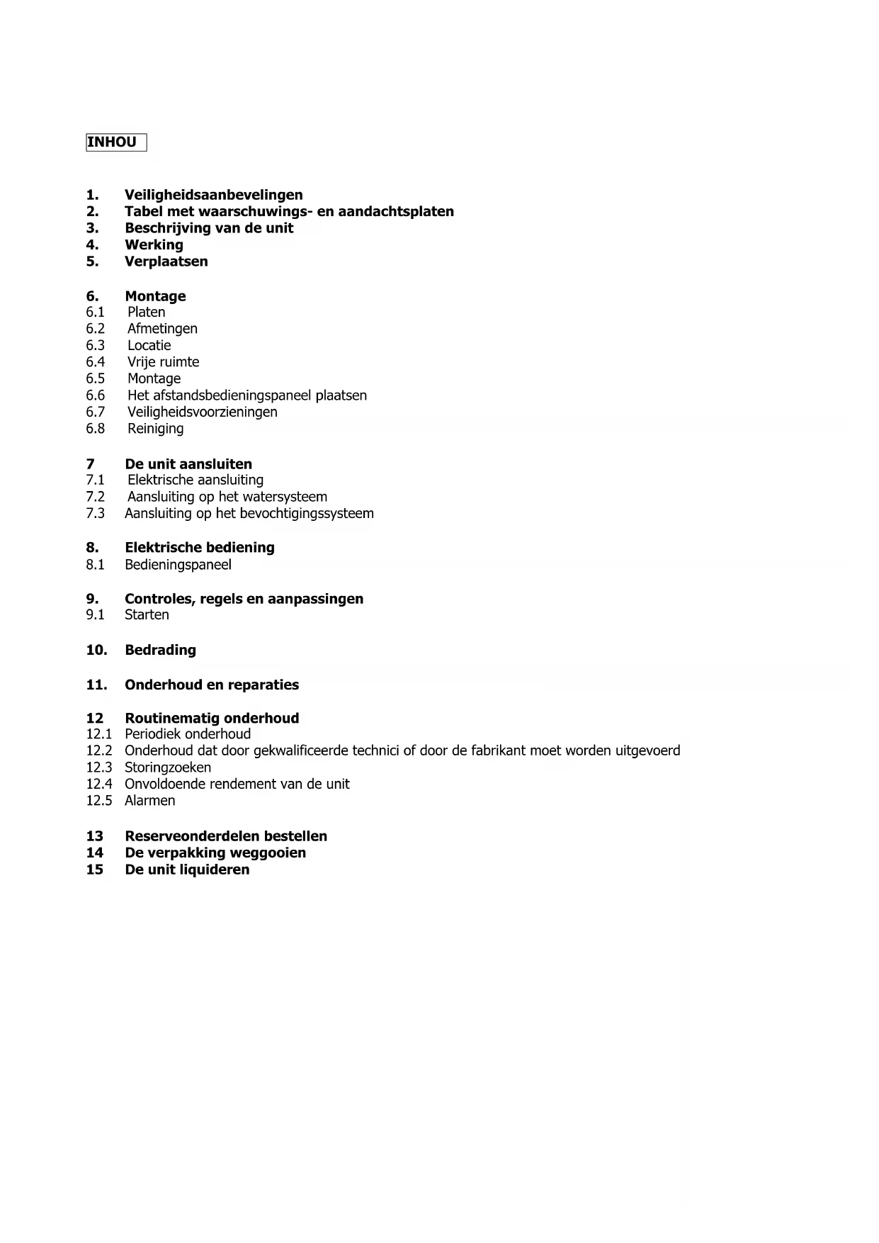 RESERVEONDERDELEN BESTELLEN Refereer bij de bestelling van reserveonderdelen naar het nummer dat op de plaat van de unit staat. WAARSCHUWING Versleten onderdelen mogen alleen door gekwalificeerd personeel of door de fabrikant vervangen worden.