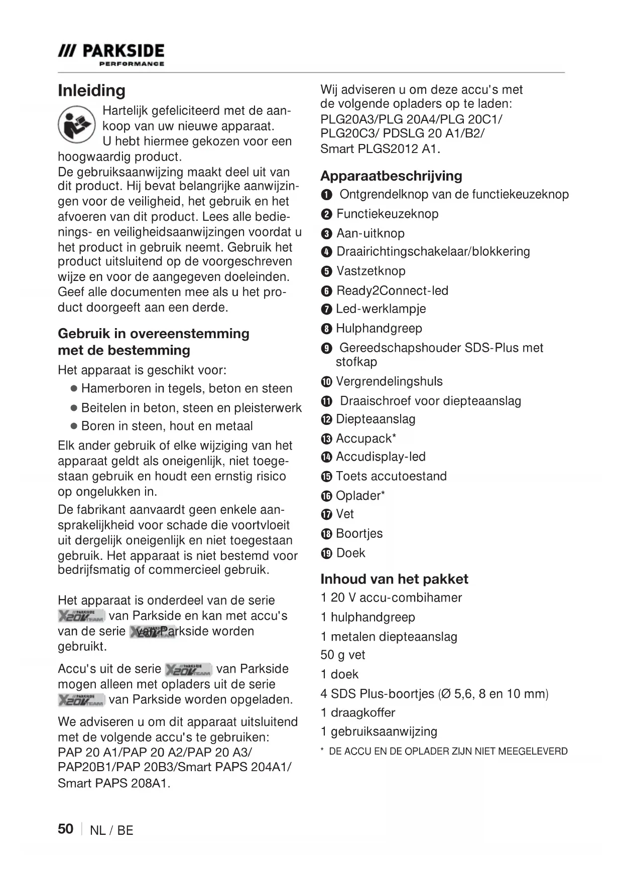 Het apparaat is geschikt voor: ▯ Hamerboren in tegels, beton en steen ▯ Beitelen in beton, steen en pleisterwerk ▯ Boren in steen, hout en metaal Elk ander gebruik of elke wijziging van het apparaat geldt als oneigenlijk, niet toege- staan gebruik en houdt een ernstig risico op ongelukken in. De fabrikant aanvaardt geen enkele aan- sprakelijkheid voor schade die voortvloeit uit dergelijk oneigenlijk en niet toegestaan gebruik. Het apparaat is niet bestemd voor bedrijfsmatig of commercieel gebruik. Het apparaat is onderdeel van de serie van Parkside en kan met accu's van de serie van Parkside worden gebruikt. Accu's uit de serie van Parkside mogen alleen met opladers uit de serie van Parkside worden opgeladen. We adviseren u om dit apparaat uitsluitend met de volgende accu's te gebruiken: 3$3$3$3$3$3ּ$ 3$3ּּ%3$3ּּ%6PDUW3$36ּּ$ 6PDUW3$36ּּ$. Wij adviseren u om deze accu's met de volgende opladers op te laden: 3/*ּּ$3/*ּּ$3/*ּּ& 3/*ּּ&3'6/*$% 6PDUWּ3/*6ּ$ $SSDUDDWEHVFKULMYLQJ 1 Ontgrendelknop van de functiekeuzeknop 2 Functiekeuzeknop 3 Aan-uitknop 4 Draairichtingschakelaar/blokkering 5 Vastzetknop 6 Ready2Connect-led 7 Led-werklampje 8 Hulphandgreep 9 Gereedschapshouder SDS-Plus met stofkap 0 Vergrendelingshuls q Draaischroef voor diepteaanslag w Diepteaanslag e Accupack* r Accudisplay-led t Toets accutoestand z Oplader* u Vet i Boortjes o Doek ,QKRXGYDQKHWSDNNHW 1 20 V accu-combihamer 1 hulphandgreep 1 metalen diepteaanslag 50 g vet 1 doek 4 SDS Plus-boortjes (Ø 5,6, 8 en 10 mm) GUDDJNRƙHU 1 gebruiksaanwijzing