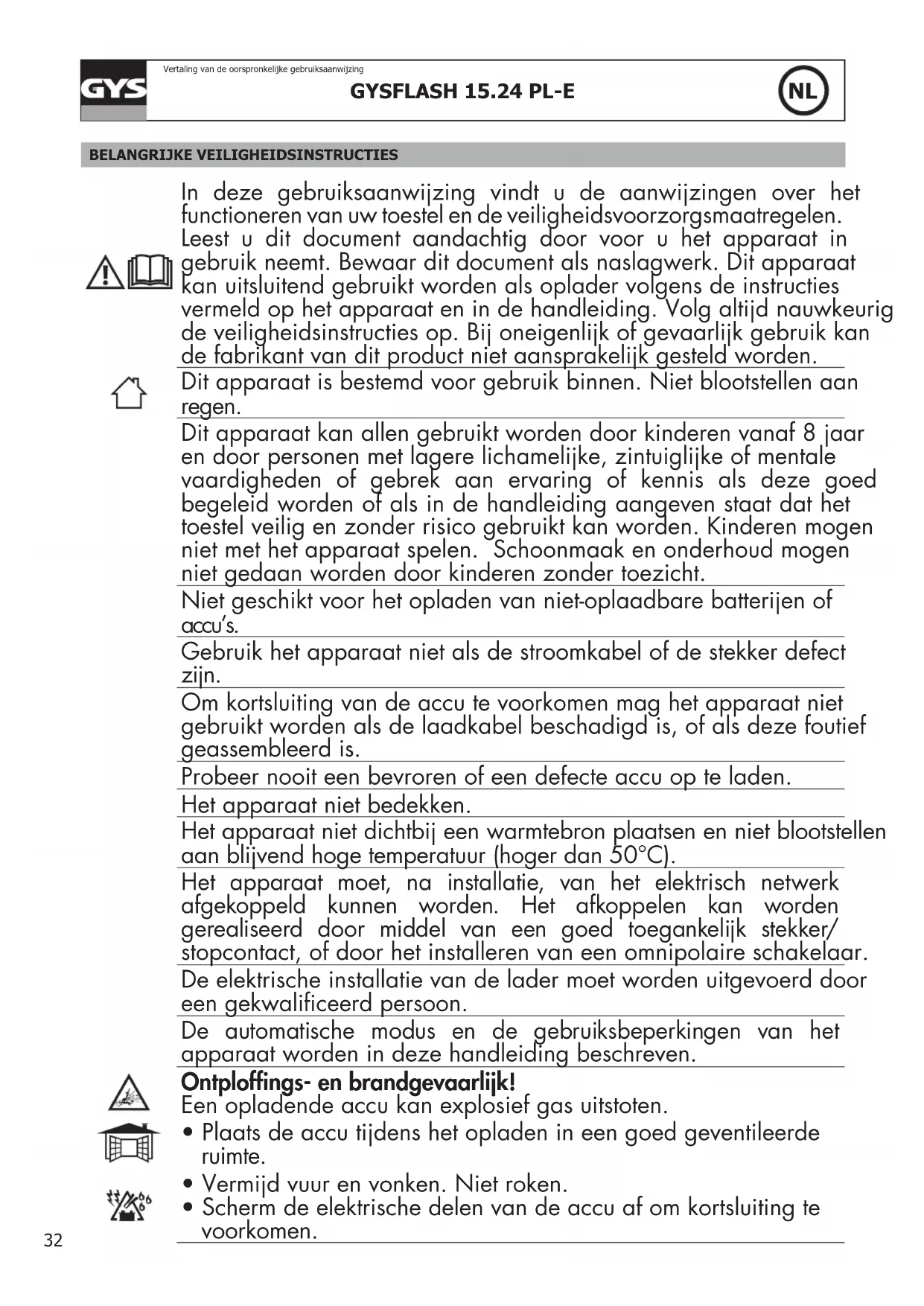 GYSFLASH 15.24 PL-E RUVertaling van de oorspronkelijke gebruiksaanwijzing BELANGRIJKE VEILIGHEIDSINSTRUCTIES In deze gebruiksaanwijzing vindt u de aanwijzingen over het functioneren van uw toestel en de veiligheidsvoorzorgsmaatregelen. Leest u dit document aandachtig door voor u het apparaat in gebruik neemt. Bewaar dit document als naslagwerk. Dit apparaat kan uitsluitend gebruikt worden als oplader volgens de instructies vermeld op het apparaat en in de handleiding. Volg altijd nauwkeurig de veiligheidsinstructies op. Bij oneigenlijk of gevaarlijk gebruik kan de fabrikant van dit product niet aansprakelijk gesteld worden. Dit apparaat is bestemd voor gebruik binnen. Niet blootstellen aan regen. Dit apparaat kan allen gebruikt worden door kinderen vanaf 8 jaar en door personen met lagere lichamelijke, zintuiglijke of mentale vaardigheden of gebrek aan ervaring of kennis als deze goed begeleid worden of als in de handleiding aangeven staat dat het toestel veilig en zonder risico gebruikt kan worden. Kinderen mogen niet met het apparaat spelen. Schoonmaak en onderhoud mogen niet gedaan worden door kinderen zonder toezicht. Niet geschikt voor het opladen van niet-oplaadbare batterijen of accu’s. Gebruik het apparaat niet als de stroomkabel of de stekker defect zijn. Om kortsluiting van de accu te voorkomen mag het apparaat niet gebruikt worden als de laadkabel beschadigd is, of als deze foutief geassembleerd is. Probeer nooit een bevroren of een defecte accu op te laden. Het apparaat niet bedekken. Het apparaat niet dichtbij een warmtebron plaatsen en niet blootstellen aan blijvend hoge temperatuur (hoger dan 50°C). Het apparaat moet, na installatie, van het elektrisch netwerk afgekoppeld kunnen worden. Het afkoppelen kan worden gerealiseerd door middel van een goed toegankelijk stekker/ stopcontact, of door het installeren van een omnipolaire schakelaar. De elektrische installatie van de lader moet worden uitgevoerd door een gekwaliceerd persoon. De automatische modus en de gebruiksbeperkingen van het apparaat worden in deze handleiding beschreven. Ontplofngs- en brandgevaarlijk! Een opladende accu kan explosief gas uitstoten.