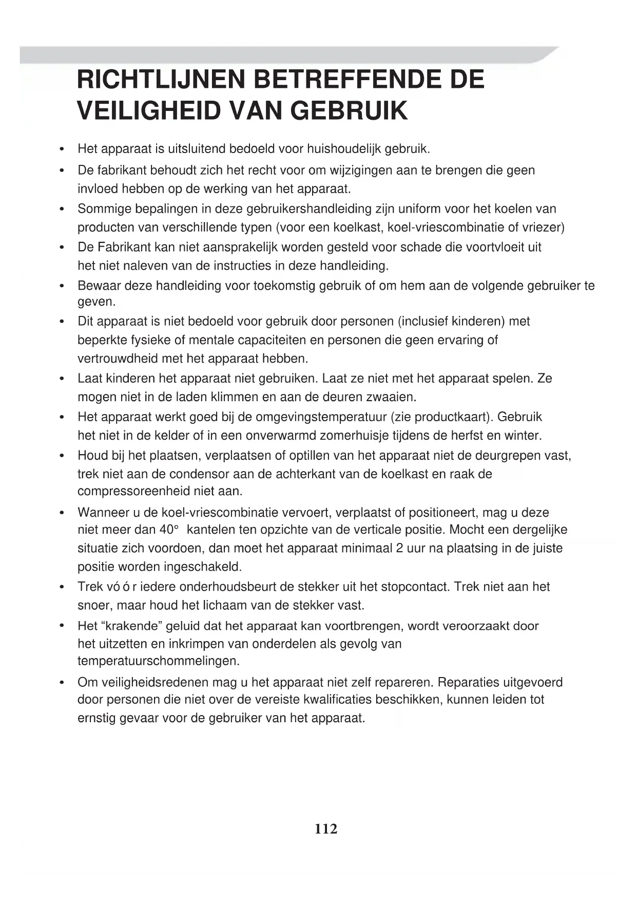 Om veiligheidsredenen mag u het apparaat niet zelf repareren. Reparaties uitgevoerd door personen die niet over de vereiste kwalificaties beschikken, kunnen leiden tot ernstig gevaar voor de gebruiker van het apparaat. 112• Lucht de ruimte waarin het apparaat staat gedurende enkele minuten (de grootte van de ruimte voor een product dat isobutaan/R600a bevat moet minimaal 4 m