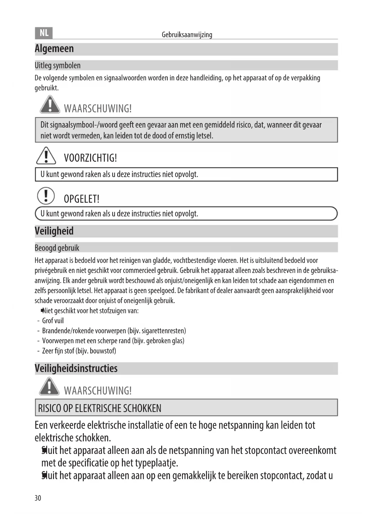 Sluit het apparaat alleen aan op een gemakkelijk te bereiken stopcontact, zodat u U kunt gewond raken als u deze instructies niet opvolgt. OPGELET! WAARSCHUWING! Dit signaalsymbool-/woord geeft een gevaar aan met een gemiddeld risico, dat, wanneer dit gevaar niet wordt vermeden, kan leiden tot de dood of ernstig letsel. VOORZICHTIG! U kunt gewond raken als u deze instructies niet opvolgt.31 Gebruiksaanwijzing