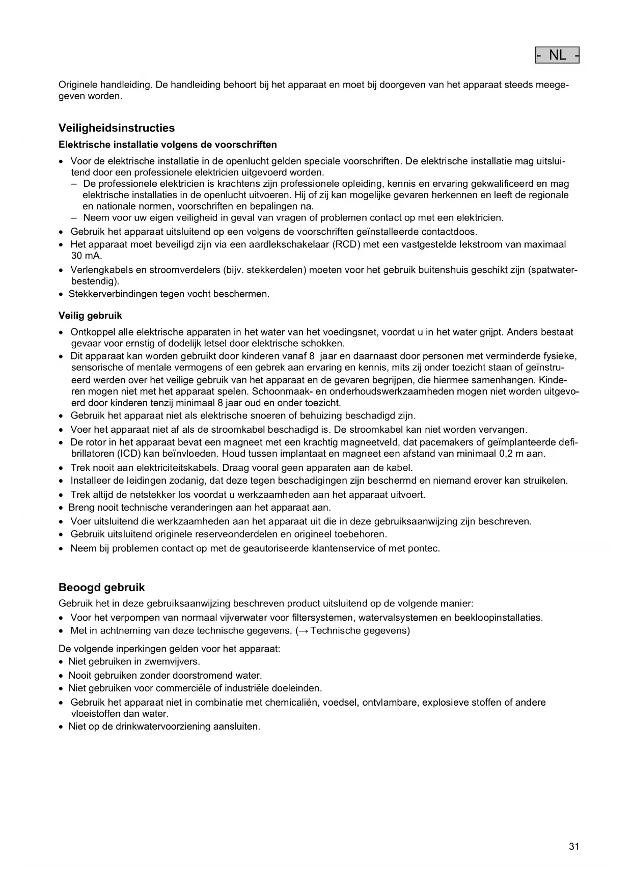 - NL - Originele handleiding. De handleiding behoort bij het apparaat en moet bij doorgeven van het apparaat steeds meege- geven worden. Veiligheidsinstructies Elektrische installatie volgens de voorschriften