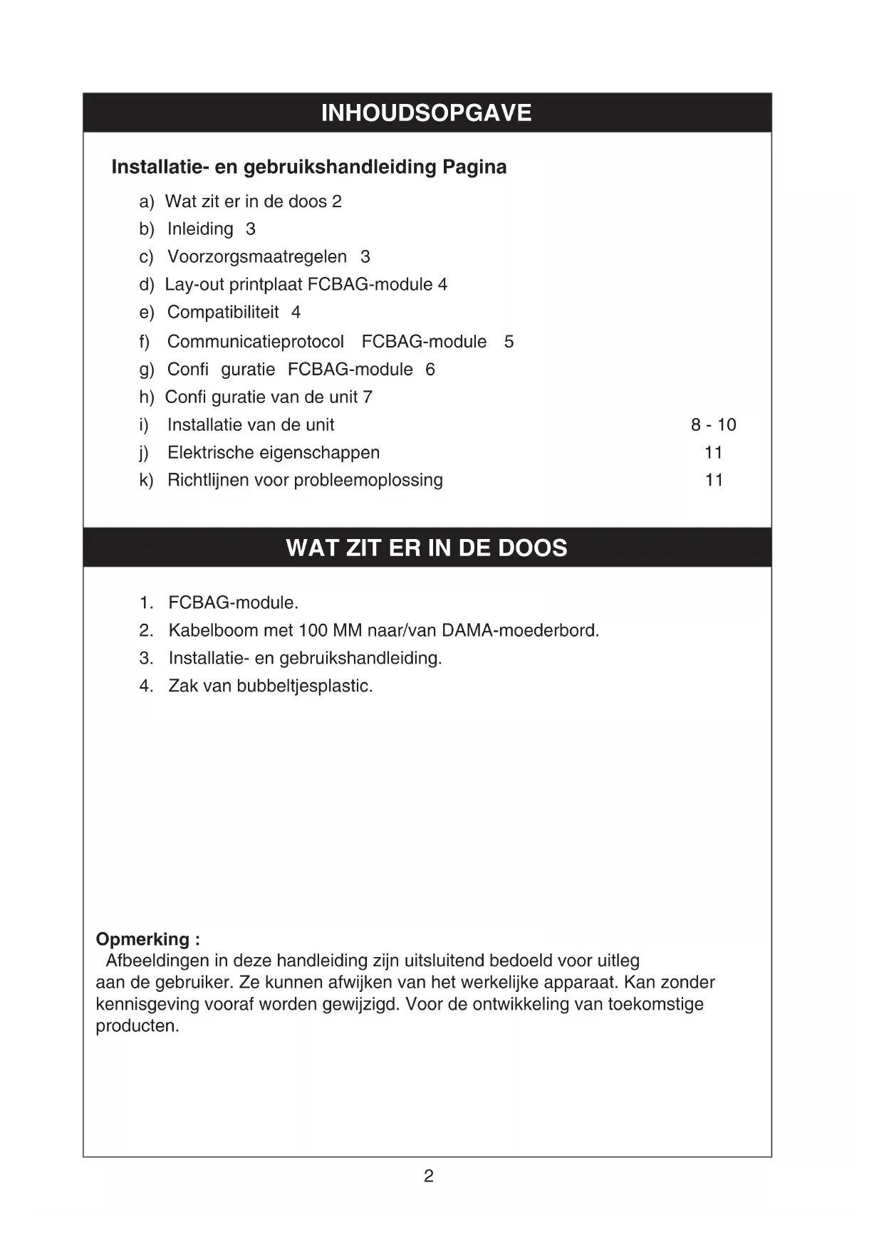 Mauvais réglage sur le panneau principal DIP_Confi g Led clignotante Pas de clignotement Assurez-vous que seul le commutateur Dip « E » est activé pour la fonction MODBUS. ** Veuillez vous référer à la description du module FCBAG pour connaître l’emplacement de la LED. IOM_FCBAG MODULE_3P764166-1-KC_EN+ML.indb 11IOM_FCBAG MODULE_3P764166-1-KC_EN+ML.indb 11 18/10/2024 2:00:16 PM18/10/2024 2:00:16 PM2 Opmerking : Afbeeldingen in deze handleiding zijn uitsluitend bedoeld voor uitleg aan de gebruiker. Ze kunnen afwijken van het werkelijke apparaat. Kan zonder kennisgeving vooraf worden gewijzigd. Voor de ontwikkeling van toekomstige producten. INHOUDSOPGAVE Installatie- en gebruikshandleiding Pagina a) Wat zit er in de doos 2 b) Inleiding 3 c) Voorzorgsmaatregelen 3 d) Lay-out printplaat FCBAG-module 4 e) Compatibiliteit 4 f) Communicatieprotocol FCBAG-module 5 g) Confi guratie FCBAG-module 6 h) Confi guratie van de unit 7