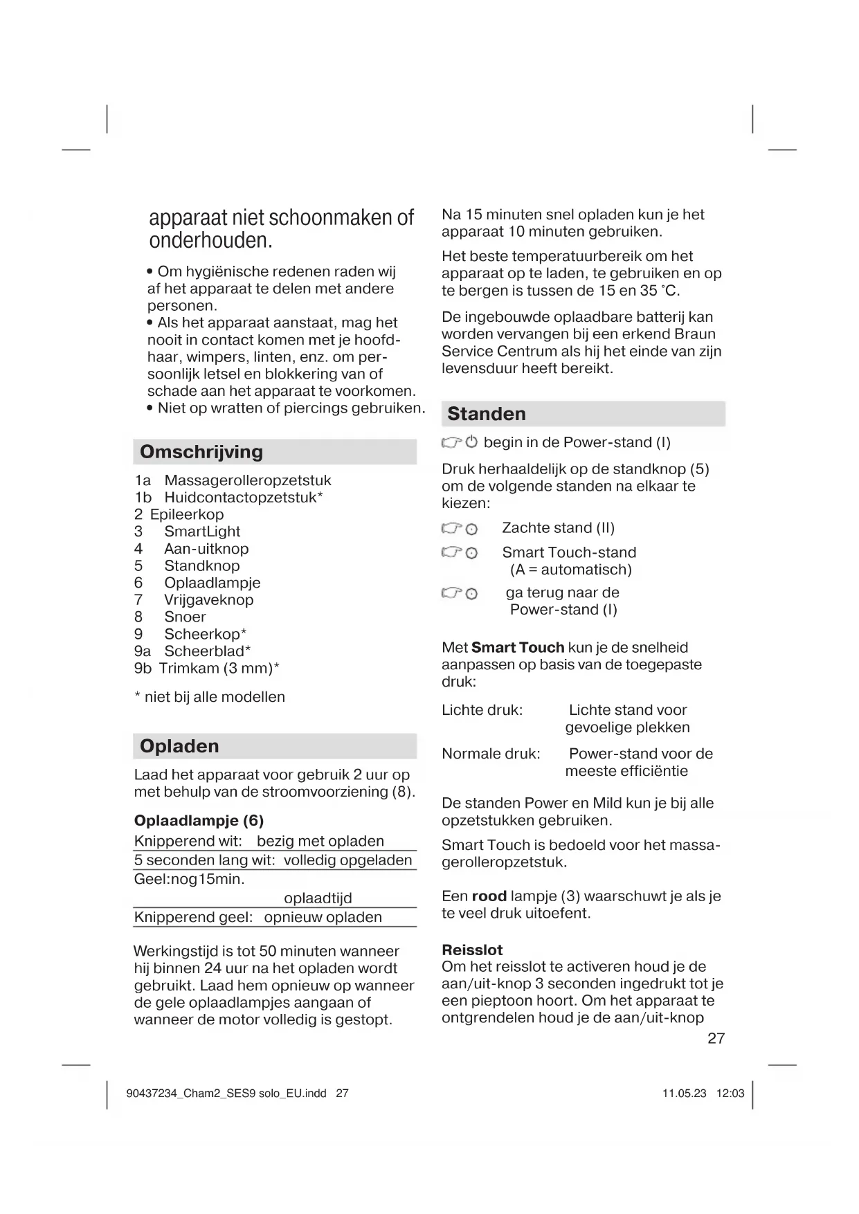 - niet bij alle modellen Opladen Laad het apparaat voor gebruik 2 uur op met behulp van de stroomvoorziening (8). Oplaadlampje (6) Knipperend wit: bezig met opladen 5 seconden lang wit: volledig opgeladen Geel: nog 15 min. oplaadtijd Knipperend geel: opnieuw opladen Werkingstijd is tot 50 minuten wanneer hij binnen 24 uur na het opladen wordt gebruikt. Laad hem opnieuw op wanneer de gele oplaadlampjes aangaan of wanneer de motor volledig is gestopt. Na 15 minuten snel opladen kun je het apparaat 10 minuten gebruiken. Het beste temperatuurbereik om het apparaat op te laden, te gebruiken en op te bergen is tussen de 15 en 35 °C. De ingebouwde oplaadbare batterij kan worden vervangen bij een erkend Braun Service Centrum als hij het einde van zijn levensduur heeft bereikt. Standen begin in de Power-stand (I) Druk herhaaldelijk op de standknop (5) om de volgende standen na elkaar te kiezen: Zachte stand (II) Smart Touch-stand (A = automatisch) ga terug naar de Power-stand (I) Met Smart Touch kun je de snelheid aanpassen op basis van de toegepaste druk: Lichte druk: Lichte stand voor gevoelige plekken Normale druk: Power-stand voor de meeste efficiëntie De standen Power en Mild kun je bij alle opzetstukken gebruiken. Smart Touch is bedoeld voor het massa- gerolleropzetstuk. Een rood lampje (3) waarschuwt je als je te veel druk uitoefent. Reisslot Om het reisslot te activeren houd je de aan/uit-knop 3 seconden ingedrukt tot je een pieptoon hoort. Om het apparaat te ontgrendelen houd je de aan/uit-knop 90437234_Cham2_SES9 solo_EU.indd 2790437234_Cham2_SES9 solo_EU.indd 27 11.05.23 12:0311.05.23 12:0328 nogmaals 3 seconden ingedrukt. Laat de aan/uit-knop los als het apparaat aan- gaat. Je kunt het apparaat ook bij het opladen ontgrendelen. Epileren (A) Tips voor beginners