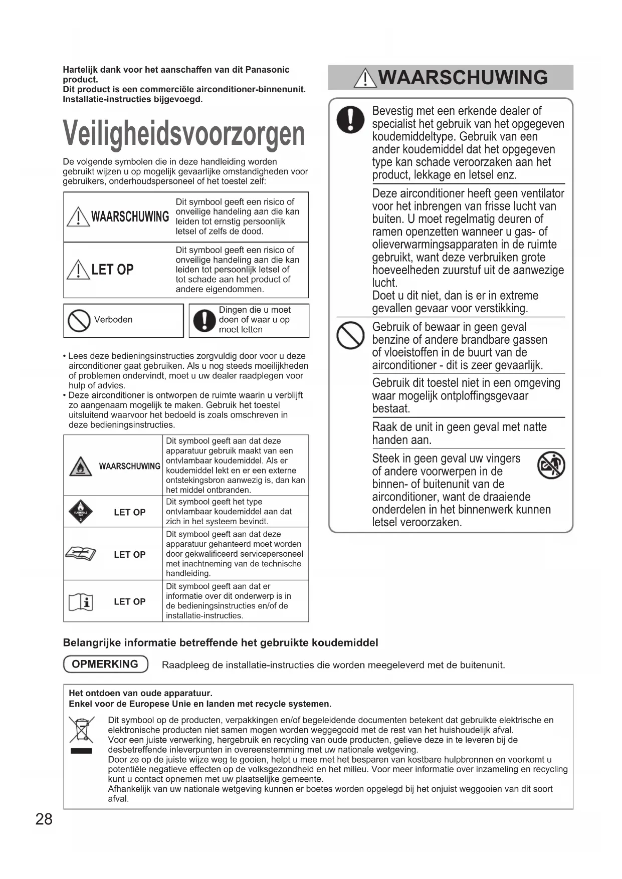 Occorre pulire periodicamente la serpentina interna e gli altri componenti dell’unità esterna.• Rivolgersi al proprio rivenditore o a un centro di assistenza. Uscita dell’ariaPresa d’ariaPulire con un panno morbido.(In presenza di molto sporco, usare un panno inumidito con acqua tiepida.) 00_340581_all.indb 27 2022/5/12 10:14:0528 Hartelijk dank voor het aanschaen van dit Panasonic product.Dit product is een commerciële airconditioner-binnenunit.Installatie-instructies bijgevoegd. Bevestig met een erkende dealer of specialist het gebruik van het opgegeven koudemiddeltype. Gebruik van een ander koudemiddel dat het opgegeven type kan schade veroorzaken aan het product, lekkage en letsel enz. Deze airconditioner heeft geen ventilator voor het inbrengen van frisse lucht van buiten. U moet regelmatig deuren of ramen openzetten wanneer u gas- of olieverwarmingsapparaten in de ruimte gebruikt, want deze verbruiken grote hoeveelheden zuurstuf uit de aanwezige lucht. Doet u dit niet, dan is er in extreme gevallen gevaar voor verstikking. Gebruik of bewaar in geen geval benzine of andere brandbare gassen of vloeistoffen in de buurt van de airconditioner - dit is zeer gevaarlijk. Gebruik dit toestel niet in een omgeving waar mogelijk ontplofngsgevaar bestaat. Raak de unit in geen geval met natte handen aan. Steek in geen geval uw vingers of andere voorwerpen in de binnen- of buitenunit van de airconditioner, want de draaiende onderdelen in het binnenwerk kunnen letsel veroorzaken. WAARSCHUWING Veiligheidsvoorzorgen De volgende symbolen die in deze handleiding worden gebruikt wijzen u op mogelijk gevaarlijke omstandigheden voor gebruikers, onderhoudspersoneel of het toestel zelf: WAARSCHUWING Dit symbool geeft een risico of onveilige handeling aan die kan leiden tot ernstig persoonlijk letsel of zelfs de dood. LET OP Dit symbool geeft een risico of onveilige handeling aan die kan leiden tot persoonlijk letsel of tot schade aan het product of andere eigendommen.VerbodenDingen die u moet doen of waar u op moet letten• Lees deze bedieningsinstructies zorgvuldig door voor u deze airconditioner gaat gebruiken. Als u nog steeds moeilijkheden of problemen ondervindt, moet u uw dealer raadplegen voor hulp of advies.• Deze airconditioner is ontworpen de ruimte waarin u verblijft zo aangenaam mogelijk te maken. Gebruik het toestel uitsluitend waarvoor het bedoeld is zoals omschreven in deze bedieningsinstructies.WAARSCHUWINGDit symbool geeft aan dat deze apparatuur gebruik maakt van een ontvlambaar koudemiddel. Als er koudemiddel lekt en er een externe ontstekingsbron aanwezig is, dan kan het middel ontbranden.LET OPDit symbool geeft het type ontvlambaar koudemiddel aan dat zich in het systeem bevindt.LET OPDit symbool geeft aan dat deze apparatuur gehanteerd moet worden door gekwalificeerd servicepersoneel met inachtneming van de technische handleiding.LET OPDit symbool geeft aan dat er informatie over dit onderwerp is in de bedieningsinstructies en/of de installatie-instructies.Belangrijke informatie betreende het gebruikte koudemiddelOPMERKING Raadpleeg de installatie-instructies die worden meegeleverd met de buitenunit.Het ontdoen van oude apparatuur. Enkel voor de Europese Unie en landen met recycle systemen. Dit symbool op de producten, verpakkingen en/of begeleidende documenten betekent dat gebruikte elektrische en elektronische producten niet samen mogen worden weggegooid met de rest van het huishoudelijk afval.Voor een juiste verwerking, hergebruik en recycling van oude producten, gelieve deze in te leveren bij de desbetreffende inleverpunten in overeenstemming met uw nationale wetgeving.Door ze op de juiste wijze weg te gooien, helpt u mee met het besparen van kostbare hulpbronnen en voorkomt u potentiële negatieve effecten op de volksgezondheid en het milieu. Voor meer informatie over inzameling en recycling kunt u contact opnemen met uw plaatselijke gemeente. Afhankelijk van uw nationale wetgeving kunnen er boetes worden opgelegd bij het onjuist weggooien van dit soort afval. 00_340581_all.indb 28 2022/5/12 10:14:0529 NEDERLANDS Als het koudemiddel in contact komt met vuur, zal dit giftige gassen produceren. Voor de veiligheid moet u de airconditioner uitschakelen en de stroomvoorziening afsluiten voor u het toestel schoonmaakt of onderhoud pleegt. Haal de stekker uit het stopcontact of schakel de stroomonderbreker uit die de airconditioner in geval van nood moet afsluiten van de hoofdstroomvoorziening in geval van nood. Gooi weg in overeenstemming met de landelijke en/of plaatselijke regelgeving. Dit product mag in geen geval worden gewijzigd of gedemonteerd. Een gewijzigde of gedemonteerde unit kan leiden tot brand, elektrische schokken, of letsel. Gebruikers mogen niet zelf het binnenwerk van de binnen- en buitenunits schoonmaken. Vraag een erkende dealer of bevoegde specialist om de units schoon te maken. Probeer deze apparatuur niet zelf te repareren wanneer deze storingen vertoont. Neem voor reparatie en verwijdering contact op met uw dealer of reparateur. Zorg ervoor dat elk toestel een apart, eigen stopcontact heeft en een hoofdschakelaar om hem af te sluiten van de netstroom, en een aardlekschakelaar, of een verliesstroomschakelaar ter bescherming tegen te hoge stromen aangebracht in de eigen stroomvoorziening. Zorg voor een apart stopcontact voor elk individueel unit; volledig loskoppelen betekent dat alle polen van de aansluiting losgekoppeld zijn van het vaste net, in overeenstemming met de regelgeving betreffende de bedrading. Om eventuele risico