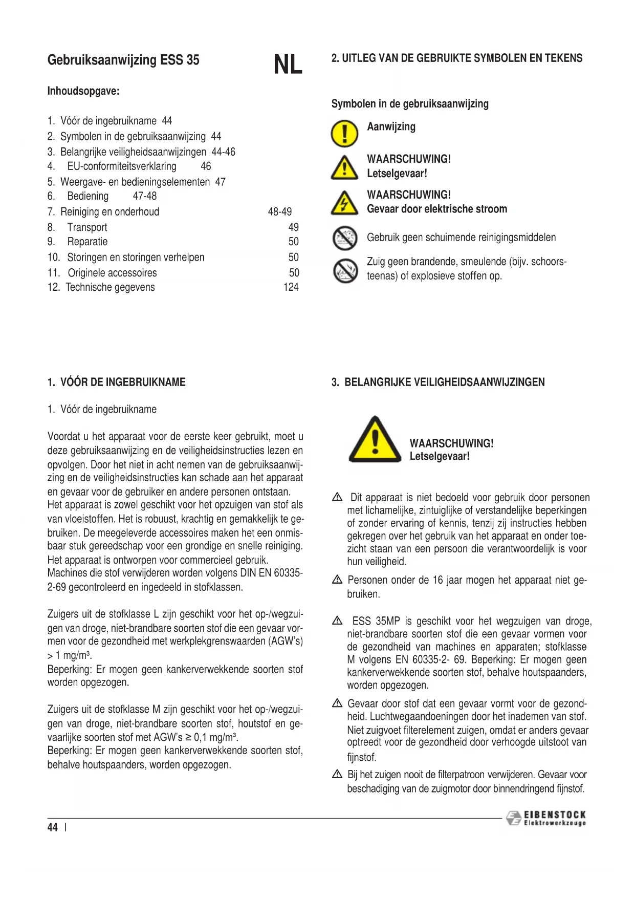 Voordat u het apparaat voor de eerste keer gebruikt, moet u deze gebruiksaanwijzing en de veiligheidsinstructies lezen en opvolgen. Door het niet in acht nemen van de gebruiksaanwij- zing en de veiligheidsinstructies kan schade aan het apparaat en gevaar voor de gebruiker en andere personen ontstaan. Het apparaat is zowel geschikt voor het opzuigen van stof als van vloeistoffen. Het is robuust, krachtig en gemakkelijk te ge- bruiken. De meegeleverde accessoires maken het een onmis- baar stuk gereedschap voor een grondige en snelle reiniging. Het apparaat is ontworpen voor commercieel gebruik. Machines die stof verwijderen worden volgens DIN EN 60335- 2-69 gecontroleerd en ingedeeld in stofklassen. Zuigers uit de stofklasse L zijn geschikt voor het op-/wegzui- gen van droge, niet-brandbare soorten stof die een gevaar vor- men voor de gezondheid met werkplekgrenswaarden (AGW’s) > 1 mg/m³. Beperking: Er mogen geen kankerverwekkende soorten stof worden opgezogen. Zuigers uit de stofklasse M zijn geschikt voor het op-/wegzui- gen van droge, niet-brandbare soorten stof, houtstof en ge- vaarlijke soorten stof met AGW’s ≥ 0,1 mg/m³. Beperking: Er mogen geen kankerverwekkende soorten stof, behalve houtspaanders, worden opgezogen. Gebruiksaanwijzing ESS 35 Inhoudsopgave:
