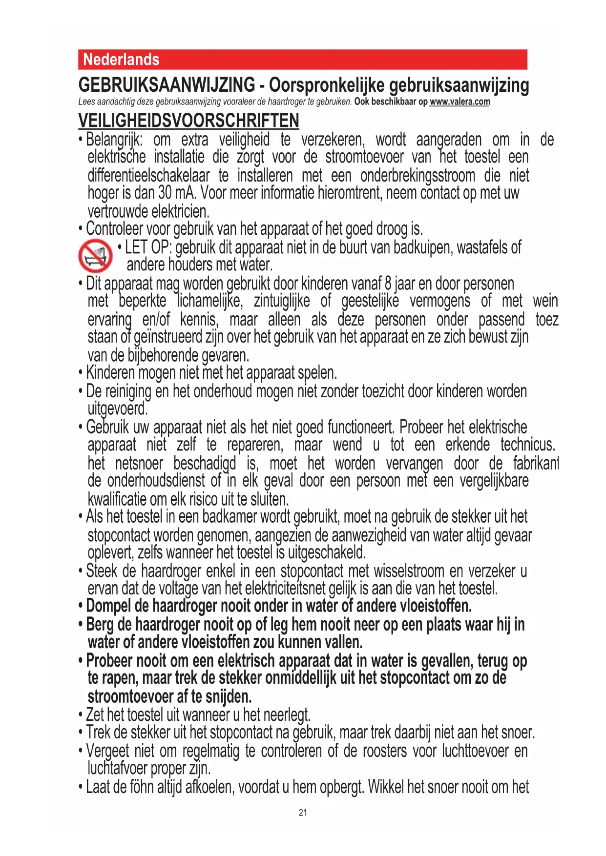Nederlands GEBRUIKSAANWIJZING - Oorspronkelijke gebruiksaanwijzing Lees aandachtig deze gebruiksaanwijzing vooraleer de haardroger te gebruiken. Ook beschikbaar op www.valera.com VEILIGHEIDSVOORSCHRIFTEN