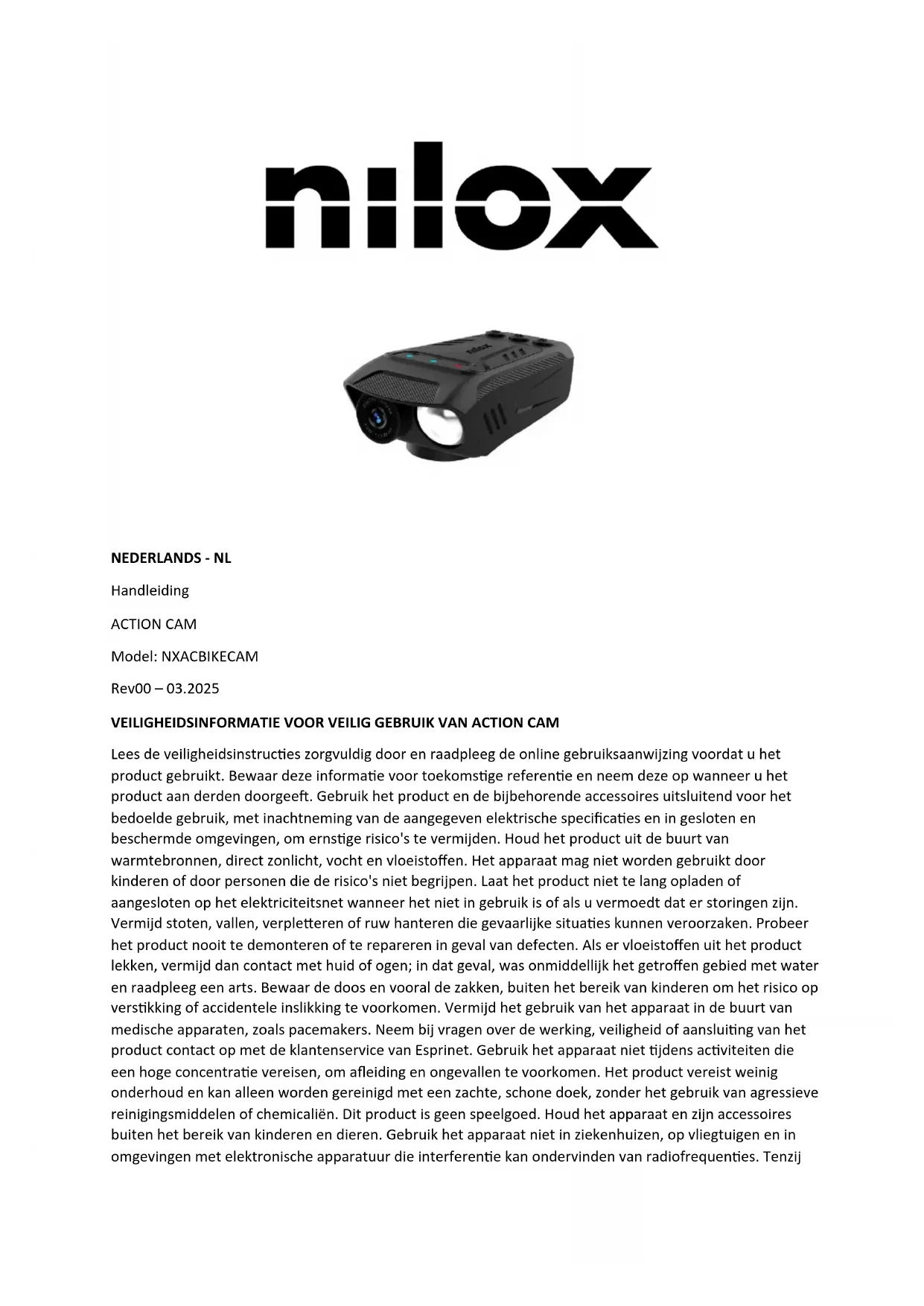 8.1. Aceste Condiții Generale de Garanție sunt reglementate de dreptul italian. Pentru orice litigiu care ar putea apărea din interpretarea sau aplicarea acestora, va competent exclusiv Tribunalul din Milano. 8.2. Se păstrează aplicarea pentru clienții nali-consumatori a dispozițiilor eventual mai favorabile și inderogabile prevăzute de legea țării în care aceștia au reședința obișnuită, în special în ceea ce privește legea aplicabilă, durata garanției și forul competent.Acest produs este conform Direcvei 2011/65/UE-2015/863/UE (RoHS). Produsul are marcajul CE și este, prin urmare, conform standardelor de siguranță stabilite de Uniunea Europeană. Nilox® este un brand deținut de Esprinet S.p.A. Toate mărcile sunt mărci înregistrate ale proprietarilor respecvi. Esprinet S.p.A., via Energy Park 20, 20871 Vimercate (MB) – Italia. Fabricat în China. www.nilox.com pentru informații și contacte: contact@esprinet.comNEDERLANDS - NL Handleiding ACTION CAM Model: NXACBIKECAM Rev00 – 03.2025 VEILIGHEIDSINFORMATIE VOOR VEILIG GEBRUIK VAN ACTION CAM Lees de veiligheidsinstruces zorgvuldig door en raadpleeg de online gebruiksaanwijzing voordat u het product gebruikt. Bewaar deze informae voor toekomsge referene en neem deze op wanneer u het product aan derden doorgee. Gebruik het product en de bijbehorende accessoires uitsluitend voor het bedoelde gebruik, met inachtneming van de aangegeven elektrische specicaes en in gesloten en beschermde omgevingen, om ernsge risico's te vermijden. Houd het product uit de buurt van warmtebronnen, direct zonlicht, vocht en vloeistoen. Het apparaat mag niet worden gebruikt door kinderen of door personen die de risico's niet begrijpen. Laat het product niet te lang opladen of aangesloten op het elektriciteitsnet wanneer het niet in gebruik is of als u vermoedt dat er storingen zijn. Vermijd stoten, vallen, verpleeren of ruw hanteren die gevaarlijke situaes kunnen veroorzaken. Probeer het product nooit te demonteren of te repareren in geval van defecten. Als er vloeistoen uit het product lekken, vermijd dan contact met huid of ogen; in dat geval, was onmiddellijk het getroen gebied met water en raadpleeg een arts. Bewaar de doos en vooral de zakken, buiten het bereik van kinderen om het risico op verskking of accidentele inslikking te voorkomen. Vermijd het gebruik van het apparaat in de buurt van medische apparaten, zoals pacemakers. Neem bij vragen over de werking, veiligheid of aansluing van het product contact op met de klantenservice van Esprinet. Gebruik het apparaat niet jdens acviteiten die een hoge concentrae vereisen, om aeiding en ongevallen te voorkomen. Het product vereist weinig onderhoud en kan alleen worden gereinigd met een zachte, schone doek, zonder het gebruik van agressieve reinigingsmiddelen of chemicaliën. Dit product is geen speelgoed. Houd het apparaat en zijn accessoires buiten het bereik van kinderen en dieren. Gebruik het apparaat niet in ziekenhuizen, op vliegtuigen en in omgevingen met elektronische apparatuur die interferene kan ondervinden van radiofrequenes. Tenzijuitdrukkelijk vermeld op de technische che, is het product niet geschikt voor onderdompeling in water of andere vloeistoen, raak het product of zijn accessoires niet aan met nae of vochge handen of andere delen van het lichaam. Het is raadzaam om het product voor elk gebruik volledig op te laden. Stel het product niet direct bloot aan hoge temperaturen die 40°C overschrijden. Esprinet S.p.A. is op geen enkele manier aansprakelijk voor letsel of schade aan personen of eigendommen die voortvloeien uit onjuist gebruik van het product. PRODUCT