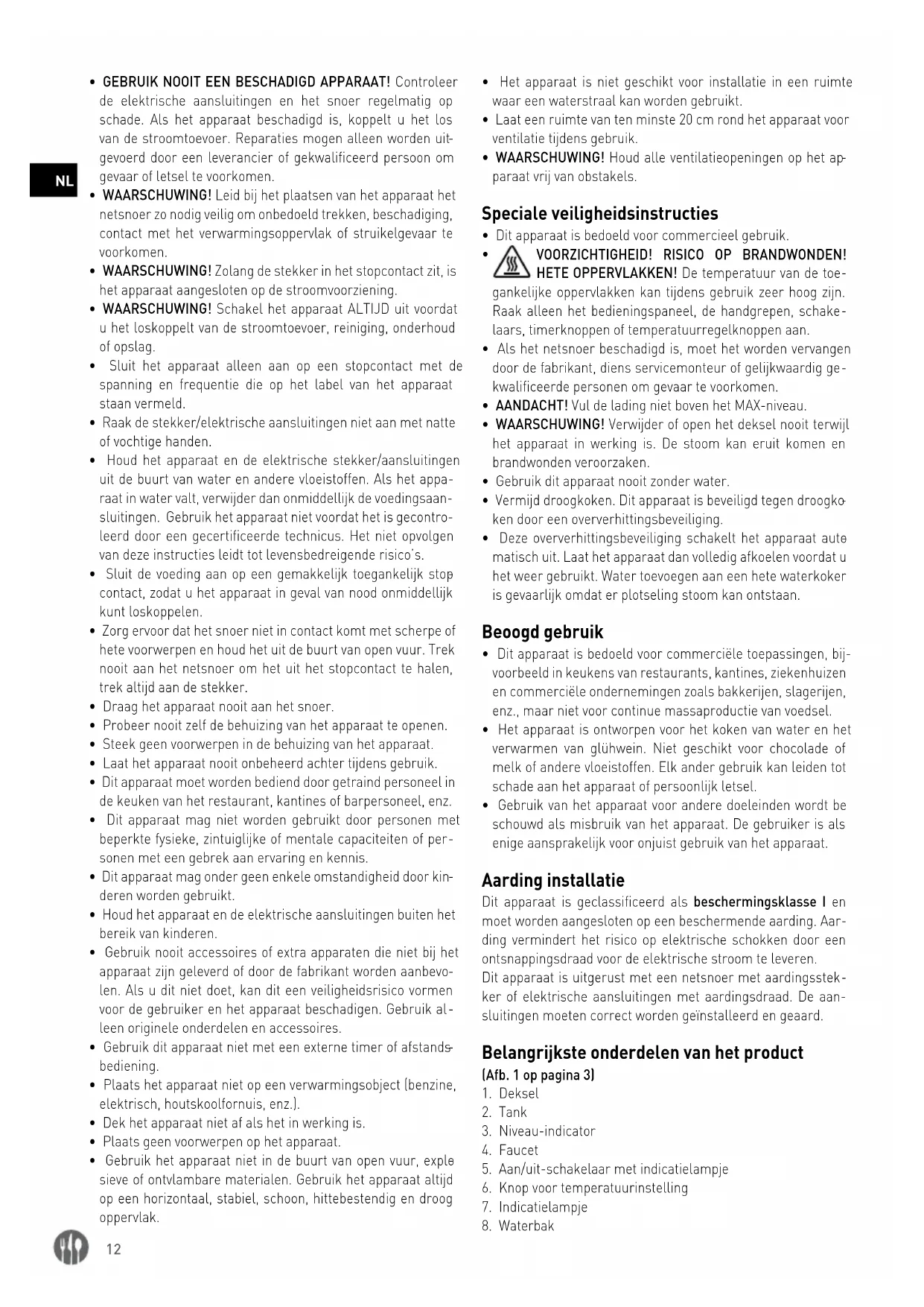 - Het apparaat is ontworpen voor het koken van water en het verwarmen van glühwein. Niet geschikt voor chocolade of melk of andere vloeistoffen. Elk ander gebruik kan leiden tot schade aan het apparaat of persoonlijk letsel.