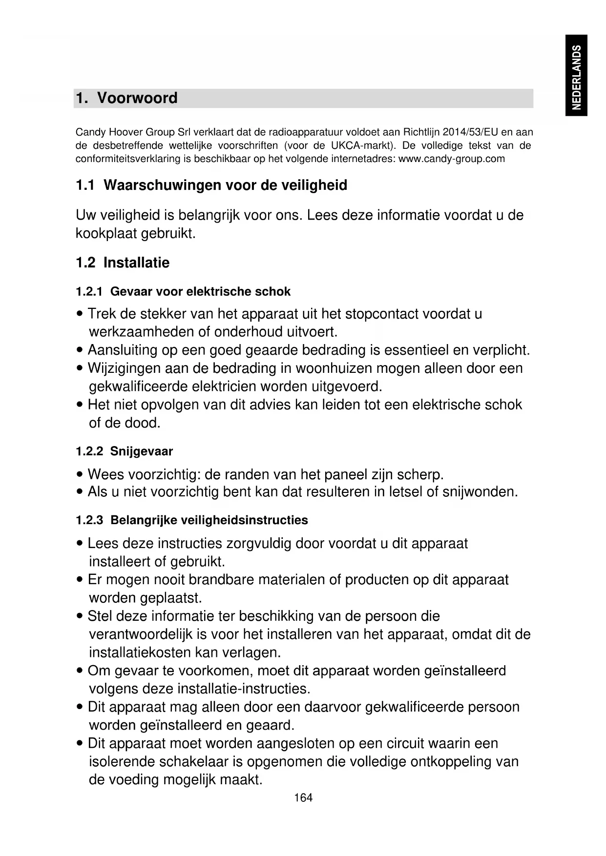 Lees deze instructies zorgvuldig door voordat u dit apparaat installeert of gebruikt. Er mogen nooit brandbare materialen of producten op dit apparaat worden geplaatst. Stel deze informatie ter beschikking van de persoon die verantwoordelijk is voor het installeren van het apparaat, omdat dit de installatiekosten kan verlagen. Om gevaar te voorkomen, moet dit apparaat worden geïnstalleerd volgens deze installatie-instructies. Dit apparaat mag alleen door een daarvoor gekwalificeerde persoon worden geïnstalleerd en geaard. Dit apparaat moet worden aangesloten op een circuit waarin een isolerende schakelaar is opgenomen die volledige ontkoppeling van de voeding mogelijk maakt.165 Als u het apparaat niet correct installeert, kunnen garantie- of aansprakelijkheidsclaims komen te vervallen. Dit apparaat mag worden gebruikt door kinderen vanaf 8 jaar en door personen met verminderde lichamelijke, zintuiglijke of geestelijke vermogens of met een gebrek aan kennis en ervaring, mits zij onder toezicht worden gehouden of instructies hebben gekregen om het apparaat veilig te kunnen gebruiken en de gevaren begrijpen die ermee gepaard gaan. Kinderen mogen niet met het apparaat spelen. Het schoonmaken en het onderhoud mag niet door kinderen worden uitgevoerd als er geen toezicht is. Als het netsnoer beschadigd is, moet het worden vervangen door de fabrikant, diens servicevertegenwoordiger of vergelijkbaar gekwalificeerde personen om gevaar te voorkomen. Waarschuwing: Als het oppervlak van kookplaten van glas, keramiek of soortgelijke materialen die onder stroom staande onderdelen beschermen gebarsten is, dan schakelt u het apparaat uit om de kans op een elektrische schok te vermijden. Metalen voorwerpen zoals messen, vorken, lepels en deksels mogen niet op de kookplaat worden geplaatst. Ze kunnen namelijk heet worden. U mag geen stoomreiniger gebruiken. Gebruik geen stoomreiniger om de kookplaat schoon te maken. Het apparaat is niet bedoeld te worden gebruikt met een externe timer of afzonderlijk afstandsbedieningssysteem. WAARSCHUWING: Brandgevaar: gebruik de kookoppervlakken niet als bewaarplek voor spullen. Blijf toezien tijdens het bereidingsproces. Een kort bereidingsproces moet continu in het oog worden gehouden. WAARSCHUWING: Onbeheerd koken op een kookplaat met vet of olie kan gevaarlijk zijn en brand veroorzaken. Probeer NOOIT om brand met water te blussen, maar schakel het apparaat uit en bedek de vlam dan met bijvoorbeeld een deksel of een branddeken.