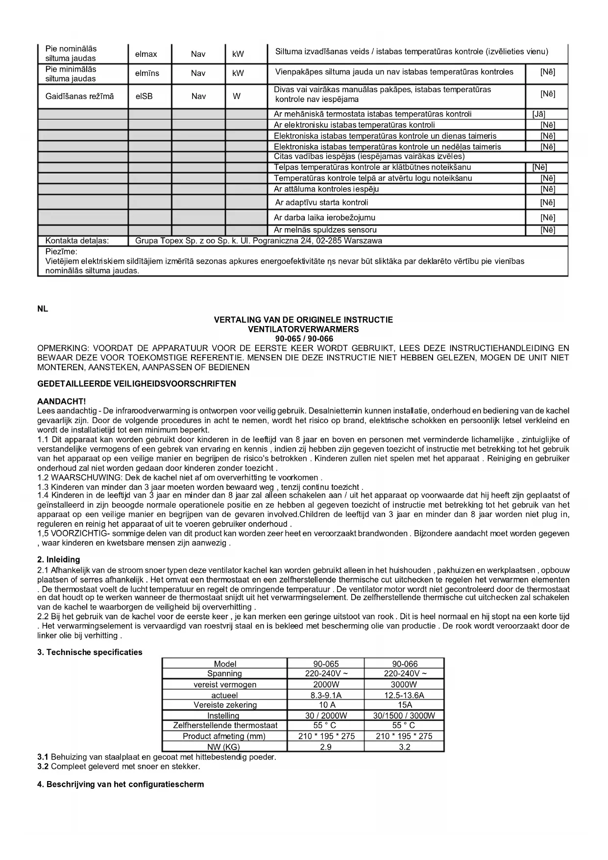 Modelidentificatie (s): 90-066 Item Symbool Waarde Eenheid Item Eenheid Warmteafgifte Type warmte-invoer, alleen voor elektrische opslagtoestellen voor lokale ruimteverwarming (selecteer er een) Nominale warmteafgifte Pnom 3 kW Handmatige regeling van de warmtebelasting met geïntegreerde thermostaat [Nee]Minimale warmteafgifte (indicatief) Pmin 1.5 kW Handmatige regeling van de warmtebelasting met kamer- en / of buitentemperatuur-feedback [Nee] Maximale continue warmteafgifte Pmax 3 kW Elektronische regeling van de warmtebelasting met feedback over de kamer- en / of buitentemperatuur [Nee] Extra elektriciteitsverbruik Door ventilator ondersteunde warmteafgifte [Nee] Bij nominale warmteafgifte elmax Nvt kW Type warmteafgifte / kamertemperatuurregeling (selecteer een) Bij minimale warmteafgifte elmin Nvt kW Eentraps warmteafgifte en geen regeling van de kamertemperatuur [Nee] In standby-modus elSB Nvt W. Twee of meer handmatige trappen, geen regeling van de kamertemperatuur [Nee]