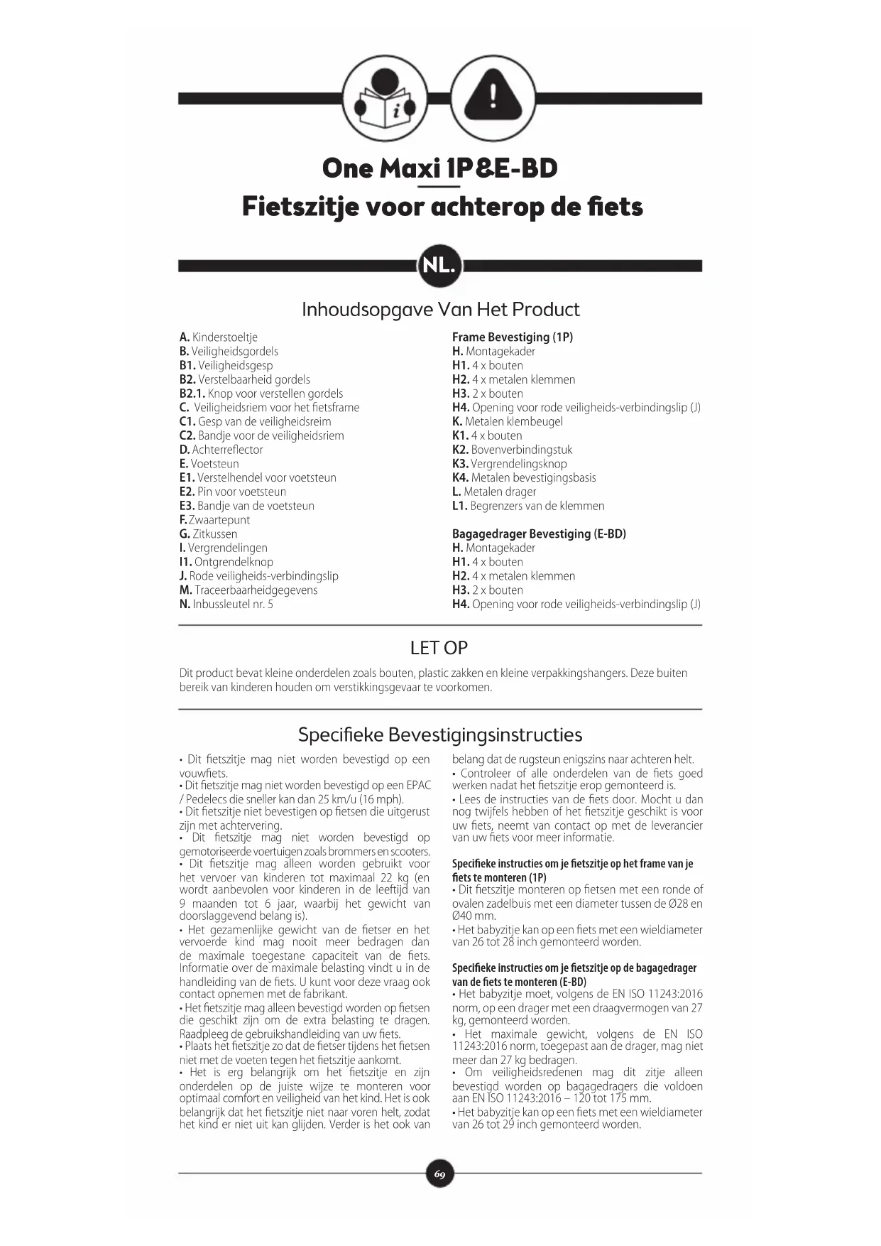 - Het babyzitje kan op een fiets met een wieldiameter van 26 tot 29 inch gemonteerd worden. Inhoudsopgave Van Het Product Specifieke Bevestigingsinstructies One Maxi 1P&E-BD Fietszitje voor achterop de fiets Dit product bevat kleine onderdelen zoals bouten, plastic zakken en kleine verpakkingshangers. Deze buiten bereik van kinderen houden om verstikkingsgevaar te voorkomen. LET OP70