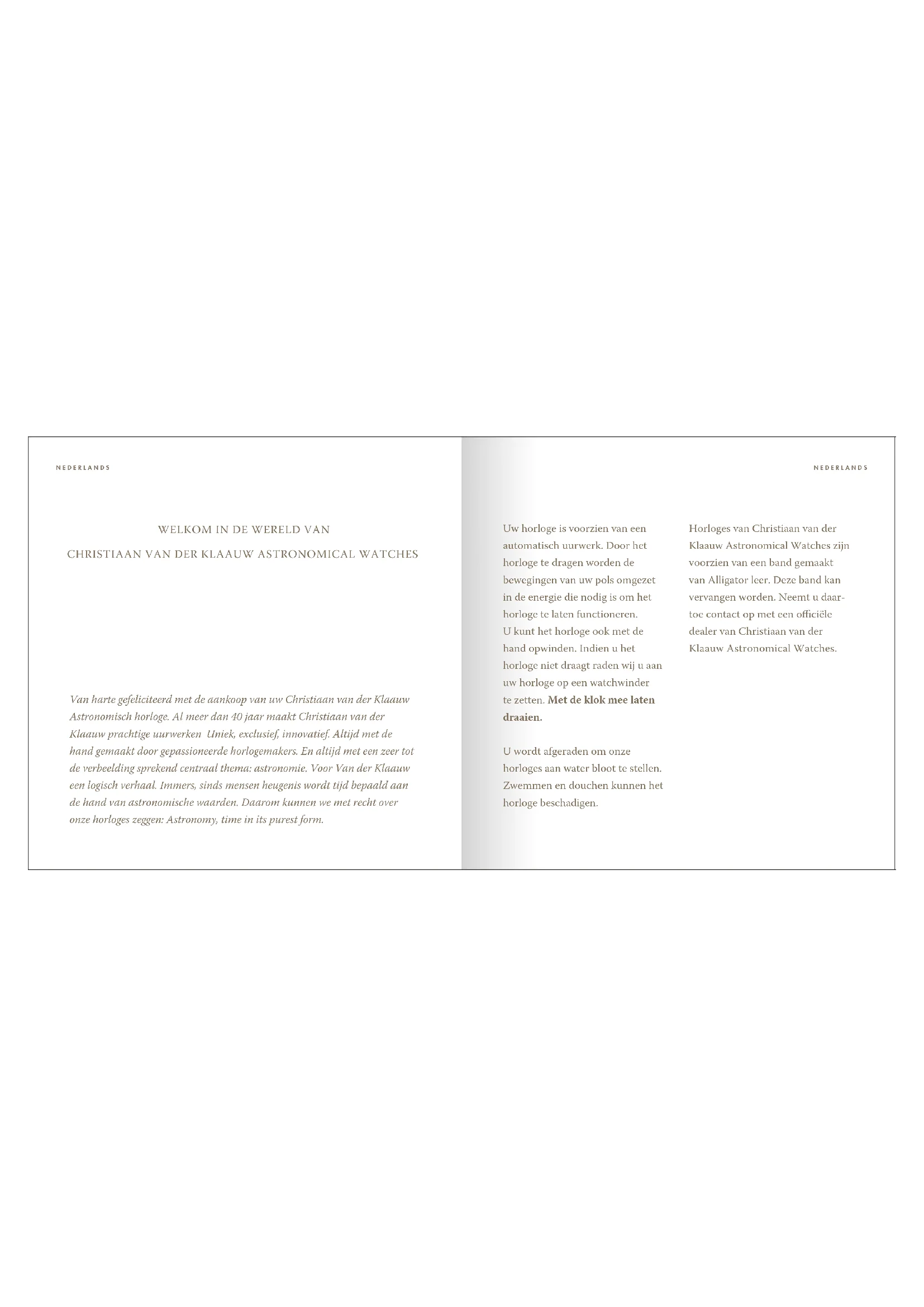 FVan harte gefeliciteerd met de aankoop van uw Christiaan van der Klaauw Astronomisch horloge. Al meer dan 40 jaar maakt Christiaan van der Klaauw prachtige uurwerken Uniek, exclusief, innovatief. Altijd met de hand gemaakt door gepassioneerde horlogemakers. En altijd met een zeer tot de verbeelding sprekend centraal thema: astronomie. Voor Van der Klaauw een logisch verhaal. Immers, sinds mensen heugenis wordt tijd bepaald aan de hand van astronomische waarden. Daarom kunnen we met recht over onze horloges zeggen: Astronomy, time in its purest form. Uw horloge is voorzien van een automatisch uurwerk. Door het horloge te dragen worden de bewegingen van uw pols omgezet in de energie die nodig is om het horloge te laten functioneren. U kunt het horloge ook met de hand opwinden. Indien u het horloge niet draagt raden wij u aan uw horloge op een watchwinder te zetten. Met de klok mee laten draaien. U wordt afgeraden om onze horloges aan water bloot te stellen. Zwemmen en douchen kunnen het horloge beschadigen. Horloges van Christiaan van der Klaauw Astronomical Watches zijn voorzien van een band gemaakt van Alligator leer. Deze band kan vervangen worden. Neemt u daar- toe contact op met een ociële dealer van Christiaan van der Klaauw Astronomical Watches. NEDERLANDS