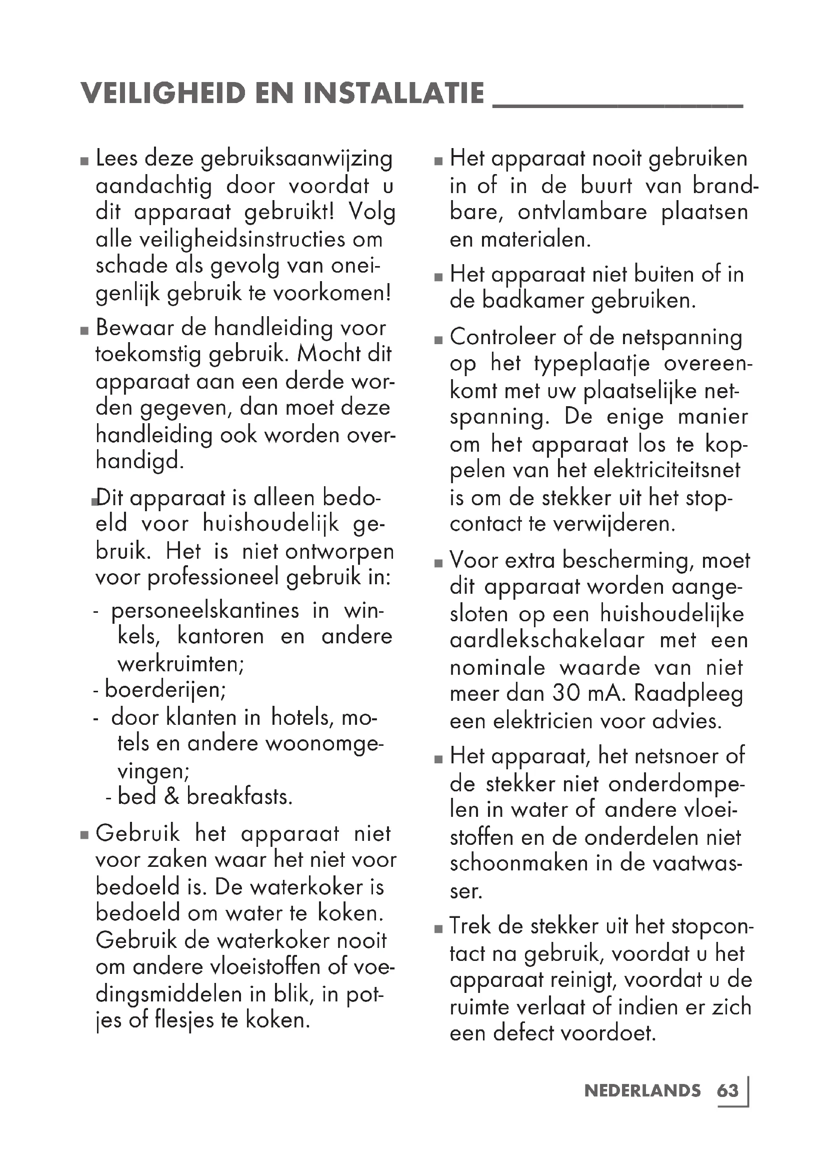 Gebruik het apparaat niet voor zaken waar het niet voor bedoeld is. De waterkoker is bedoeld om water te koken. Gebruik de waterkoker nooit om andere vloeistoffen of voe- dingsmiddelen in blik, in pot- jes of flesjes te koken.