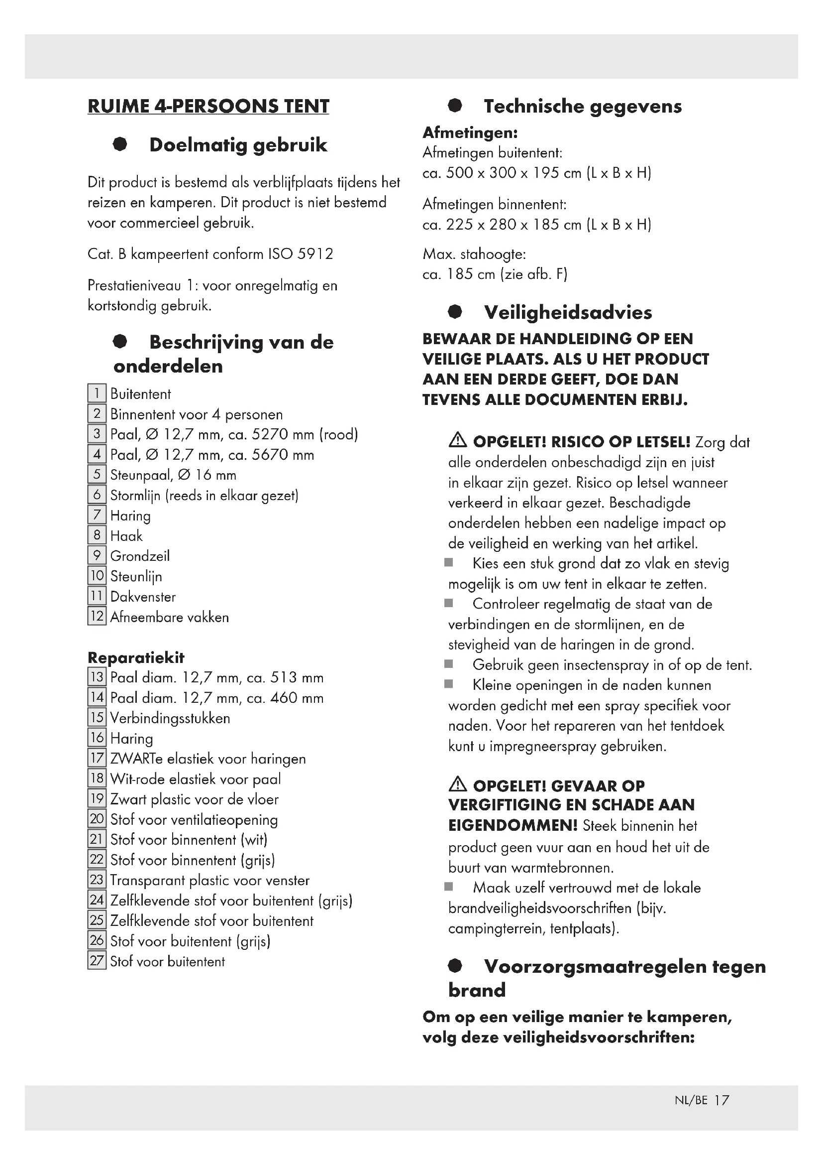 TEVENS ALLE DOCUMENTEN ERBIJ. m OPGELET! RISICO OP LETSEL! Zorg dat alle onderdelen onbeschadigd zijn en juist in elkaar zijn gezet. Risico op letsel wanneer verkeerd in elkaar gezet. Beschadigde onderdelen hebben een nadelige impact op de veiligheid en werking van het artikel. Kies een stuk grond dat zo vlak en stevig mogelijk is om uw tent in elkaar te zetten. Controleer regelmatig de staat van de verbindingen en de stormlijnen, en de stevigheid van de haringen in de grond. Gebruik geen insectenspray in of op de tent. Kleine openingen in de naden kunnen worden gedicht met een spray specifiek voor naden. Voor het repareren van het tentdoek kunt u impregneerspray gebruiken. m OPGELET! GEVAAR OP