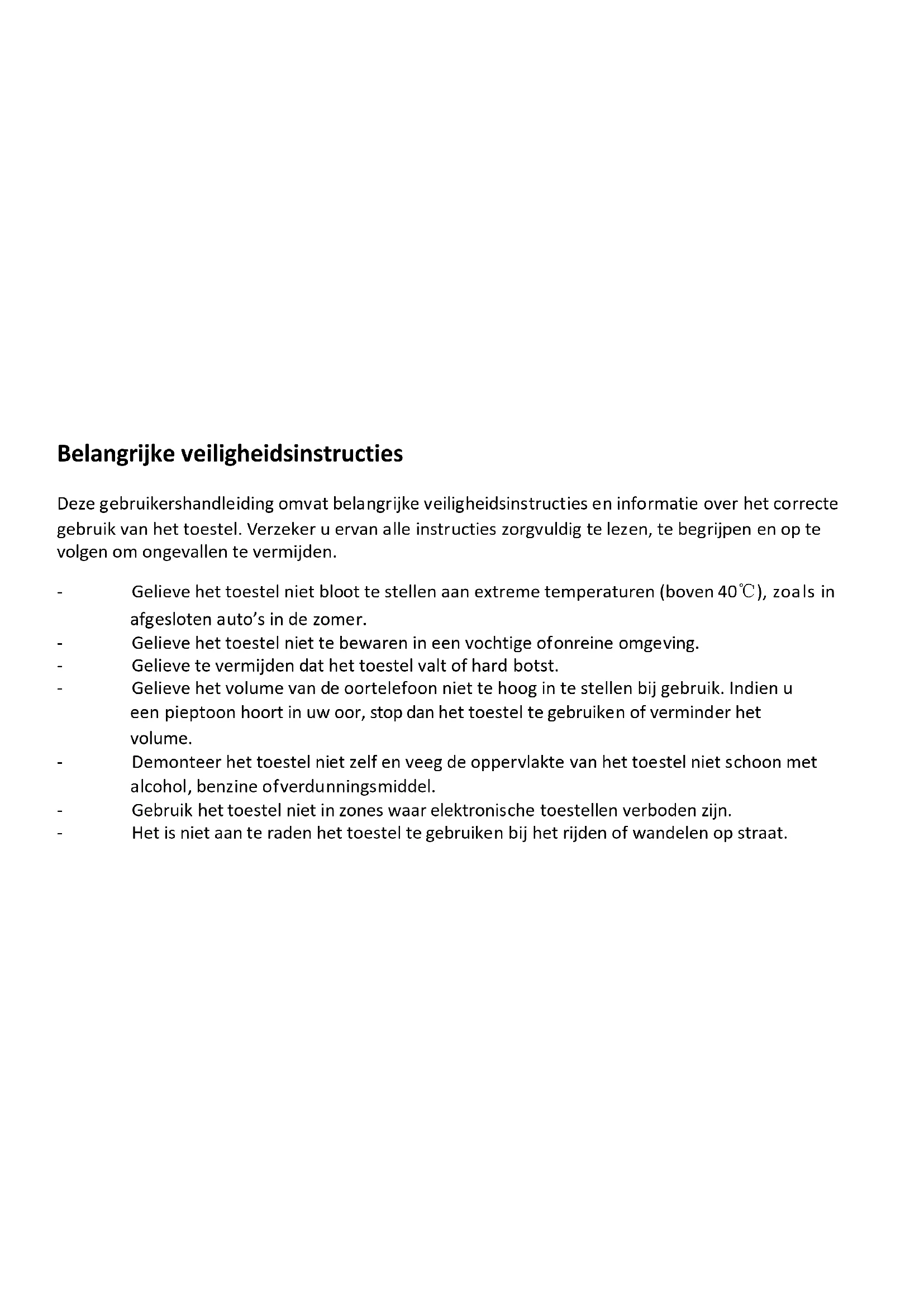- Support Micro-SD kaart functie Belangrijke veiligheidsinstructies Deze gebruikershandleiding omvat belangrijke veiligheidsinstructies en informatie over het correcte gebruik van het toestel. Verzeker u ervan alle instructies zorgvuldig te lezen, te begrijpen en op te volgen om ongevallen te vermijden. - Gelieve het toestel niet bloot te stellen aan extreme temperaturen (boven 40℃), zoals in afgesloten auto’s in de zomer. - Gelieve het toestel niet te bewaren in een vochtige of onreine omgeving. - Gelieve te vermijden dat het toestel valt of hard botst. - Gelieve het volume van de oortelefoon niet te hoog in te stellen bij gebruik. Indien u een pieptoon hoort in uw oor, stop dan het toestel te gebruiken of verminder het volume. - Demonteer het toestel niet zelf en veeg de oppervlakte van het toestel niet schoon met alcohol, benzine of verdunningsmiddel. - Gebruik het toestel niet in zones waar elektronische toestellen verboden zijn. - Het is niet aan te raden het toestel te gebruiken bij het rijden of wandelen op straat.Functie overzicht - LCD Display - Geïntegreerde Micro-SD kaart, support capaciteit tot 16GB - Speelt MP3, WMA muziekformaat bestanden - Ingebouwde Li-polymeer batterij - Ingebouwde digitale stem opname functie - Afmetingen 83 x 28 x 12 mmKnoppen 1: USB 2: USB druk knop 3: Power ON/OFF knop 4: Oortelefoon aansluiting 5: Modus 6: Next 7: Volume 8: Speel/stop 9: Back 10: Micro SD kaart gleuf 11: Microfoon 12: LCD display 13: Gat voor riemAlgemene functies Power on Schuif de Power ON/OFF knop naar de “ON” positie om het toestel in te schakelen. Power off a. In de muziek modus: houd 1 seconde toets [ ] (play/stop) ingedrukt. De muziek zal stoppen. Houd vervolgens 3 seconden toets [ ] (play/stop) ingedrukt om het toestel uit te schakelen. b. In een andere modus: houd 3 seconden toets [ ] (speel/stop) ingedrukt. c. Wanneer de batterijvoeding laag is, zal het systeem automatisch uitschakelen.Aanpassen van volume In de muziek modus en stem modus: druk op toets [ ]. U komt in de interface van volume aanpassing. Druk op toets [ ] of toets [ ] om het volume één stap te verhogen of te verlagen. Houd toets [ ] of toets [ ] lang ingedrukt om het volume sneller te verhogen of te verlagen. Notificatie: Draai het volume niet te hoog wanneer u de oortelefoon opzet, dit kan uw gehoor beschadigen.Betreffende de batterij De speler heeft een ingebouwde Li-polymeer batterij met lange levensduur. Indien de batterijvoeding laag is, zal de display “laag vermogen” tonen en de speler automatisch uitschakelen. Laad uw batterij op door de speler aan te sluiten op de PC via een USB kabel. De display toont het batterij icoon en impuls tijdens het opladen van de batterij. Het icoon zal vol/full aanduiden als de batterij volledig is opgeladen. Het laden van de batterij duurt ca. 4 uur, maar de eerste keer zal het 10 uur duren. De batterijduur hangt af van het volume waarop afgespeeld wordt, het formaat van de muziekbestanden, de toetsen-operatie, enz. U kan de speler uitschakelen om batterijvoeding te besparen.Hoofdmenu Druk op toets [ ] voor het menu. Druk op toets [ ] of toets [ ] om de gewenste functie te selecteren. Houd toets [ ] ingedrukt om wijzigingen op te slaan en het menu te verlaten. Muziek modus p. 21